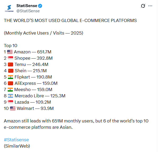 根据权威数据平台Similarweb最新排名,TEMU的月活跃用户数已达到2.46亿,位列全球电商APP第三,仅次于亚马逊和Shopee。