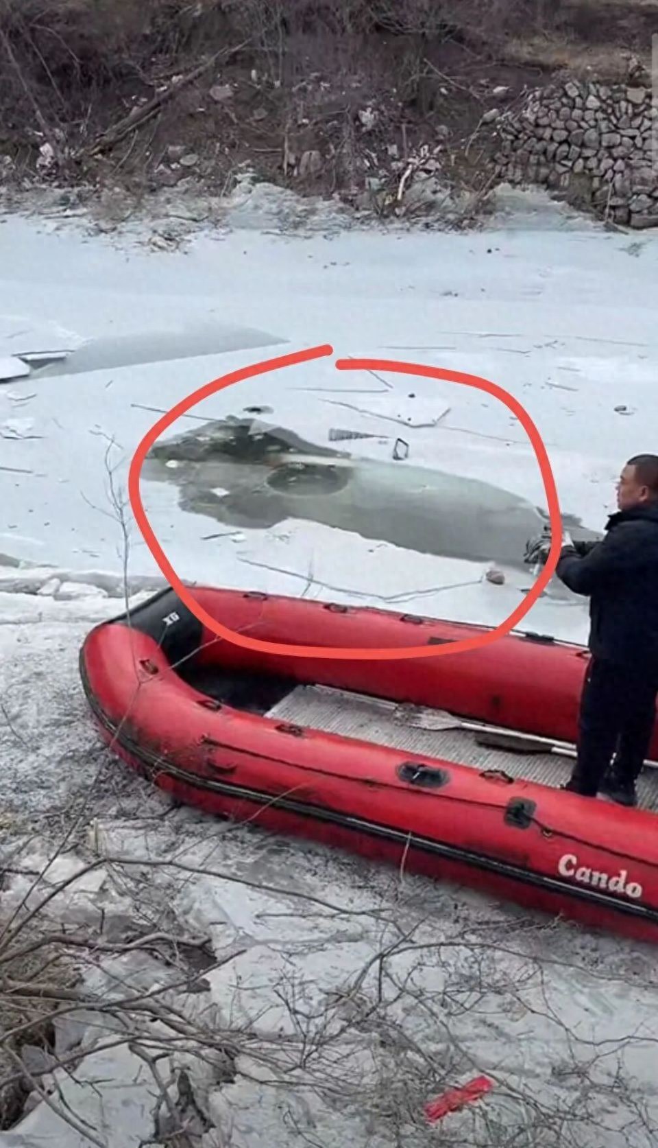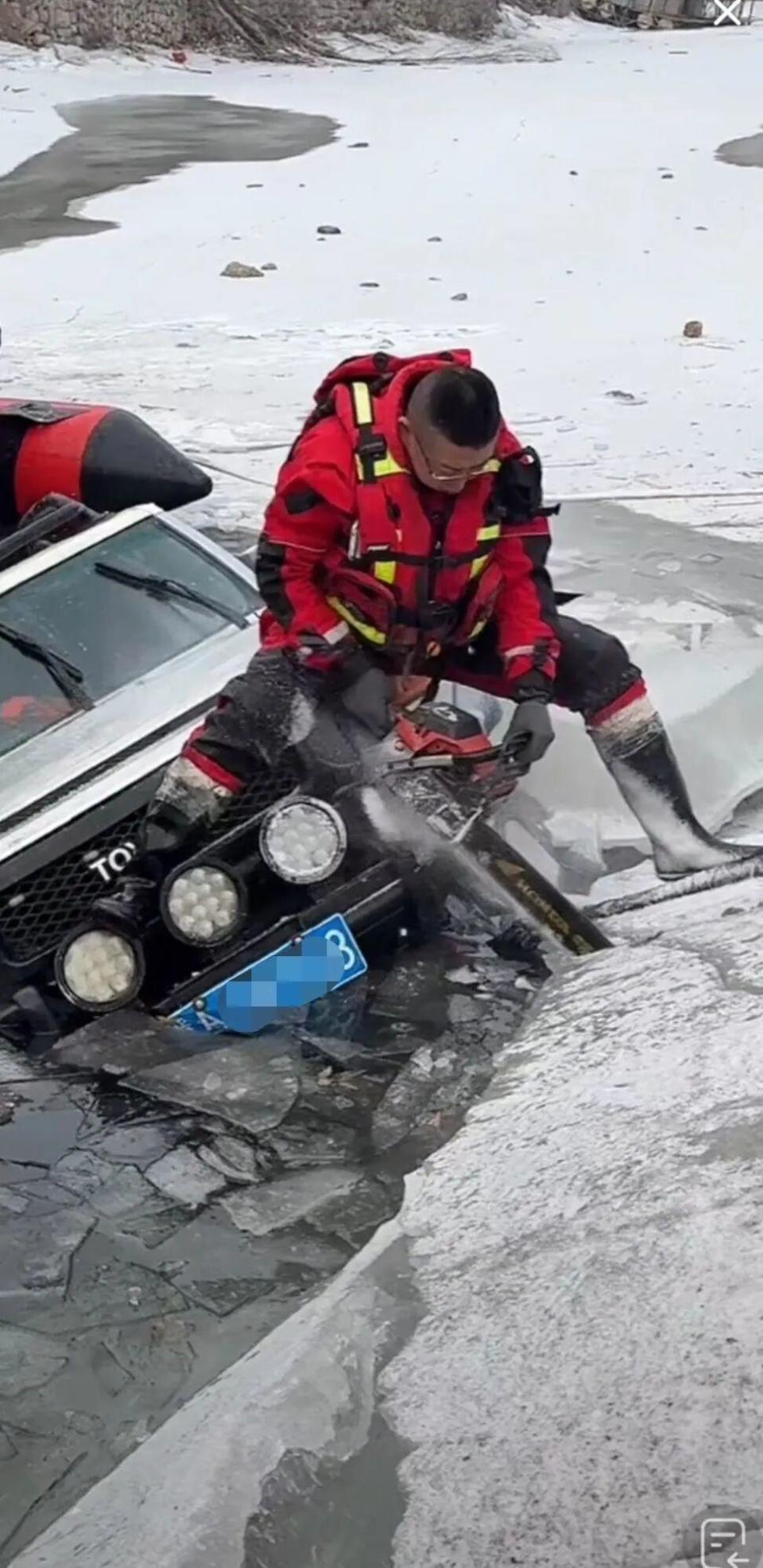 救援队使用油锯破冰(来源:受访者)