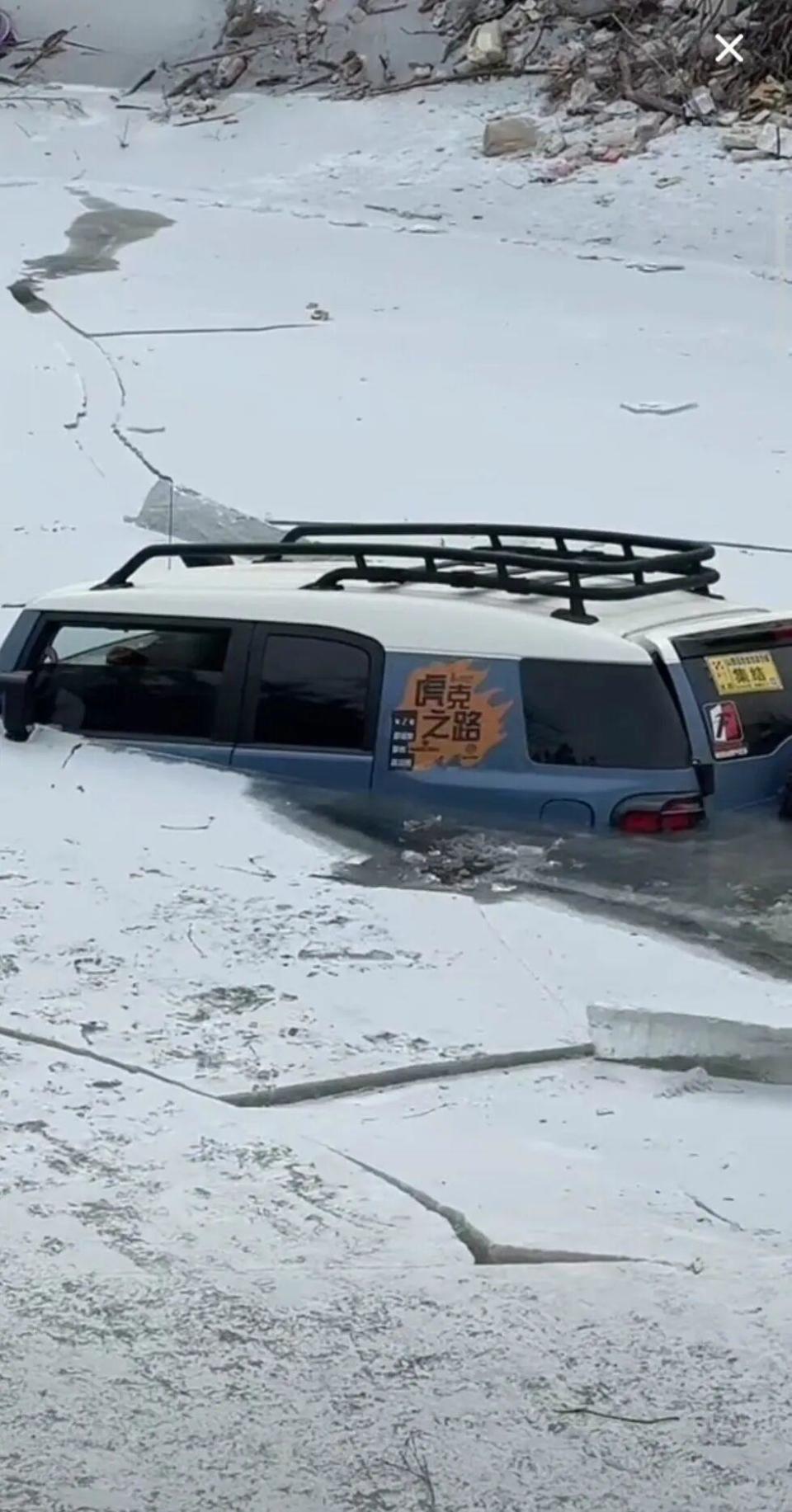 在山西太原,两辆车不慎掉入冰河被冰封无法动弹(来源:受访者)