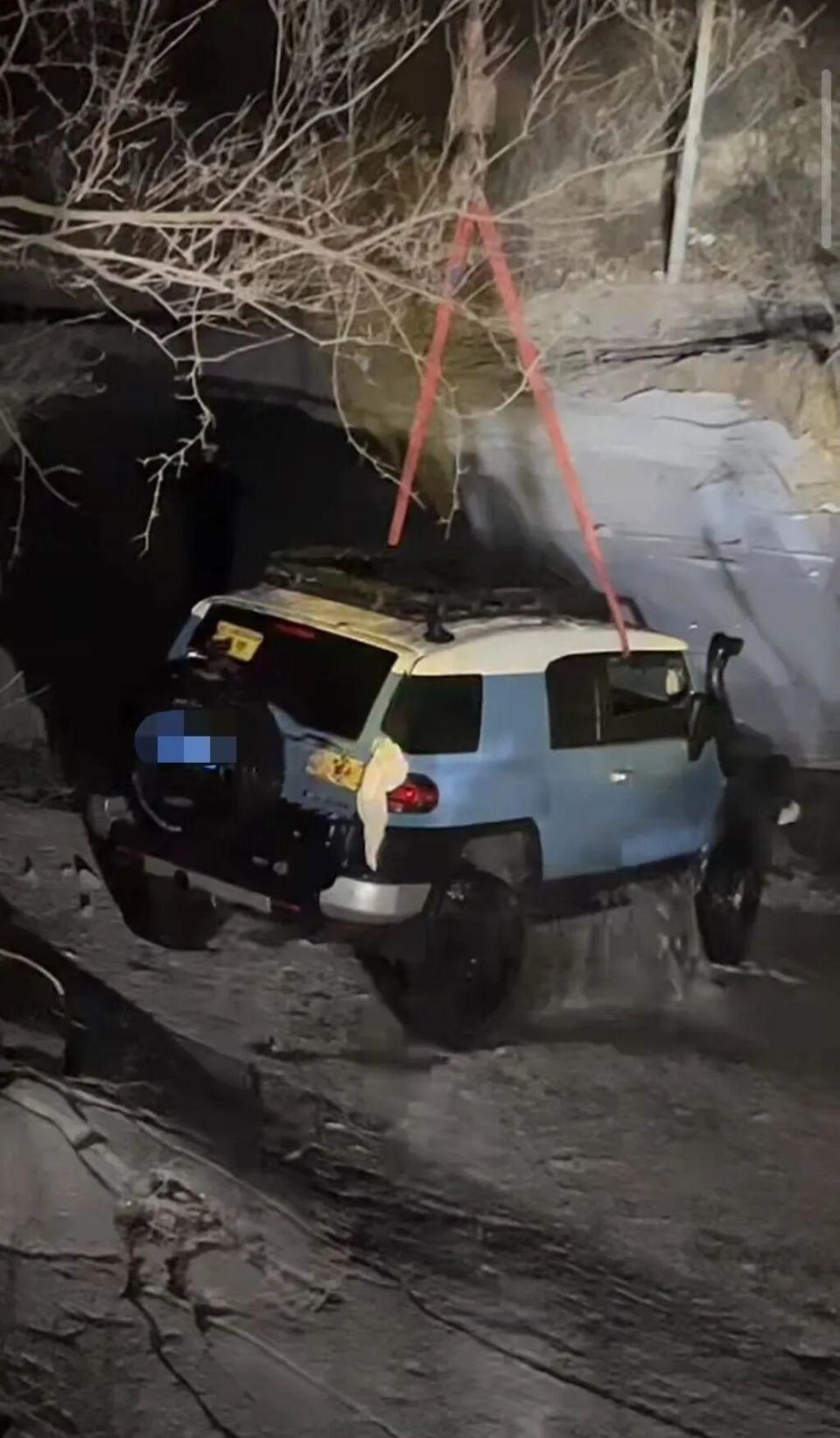 吊车将一辆掉入河道被冰封的车辆救出(来源:受访者)