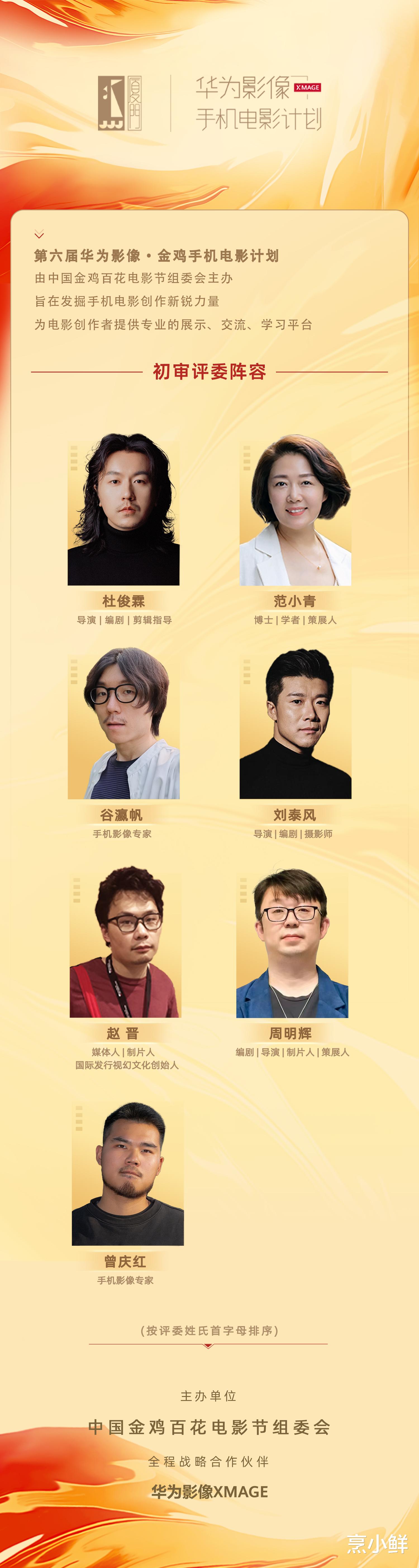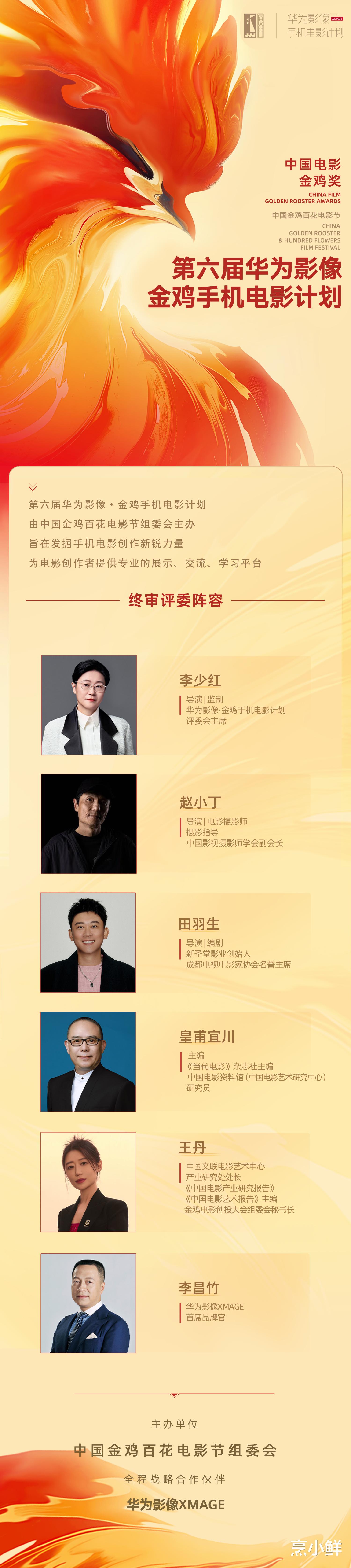 评审阵容公布本届金鸡手机电影计划终评评审团阵容正式公布:导演、监制、华为影像·金鸡手机电影计划评委会主席李少红,导演、电影摄影师、摄影指导、中国影视摄影师学会副会长赵小丁,导演、编剧、新圣堂影业创始人、成都电视电影家协会名誉主席田羽生,《当代电影》杂志社主编、中国电影资料馆(中国电影艺术研究中心)研究员皇甫宜川,中国文联电影艺术中心产业研究处处长、《中国电影产业研究报告》《中国电影艺术报告》主编、金鸡电影创投大会组委会秘书长王丹,华为影像XMAGE首席品牌官李昌竹担任终审评审。