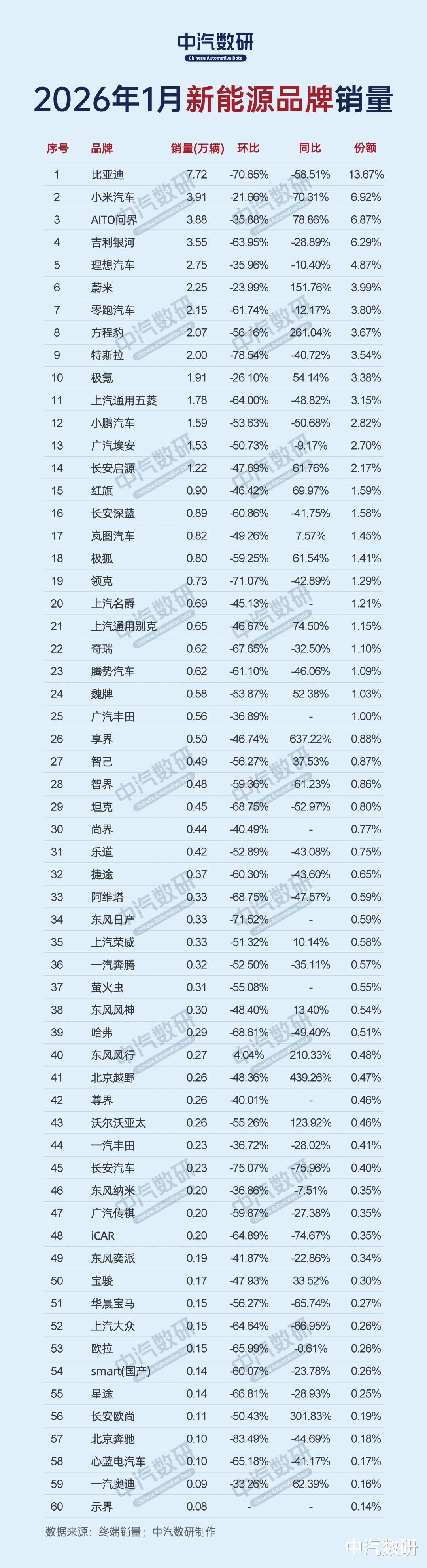 在TOP60品牌榜中,我们看到的不是传统意义上的“开门红”,而是一幅冰火两重天的景象。多数品牌销量遭遇“腰斩”,但也有少数品牌在寒风中逆势上扬。