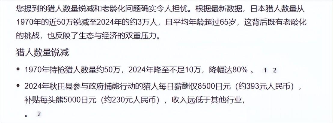 到2024年,全日本的猎人锐减至约3万人,比十多年前少了一大半,而且平均年龄都超过了65岁,年轻人根本没人愿意干这个,又危险,钱又少得可怜。