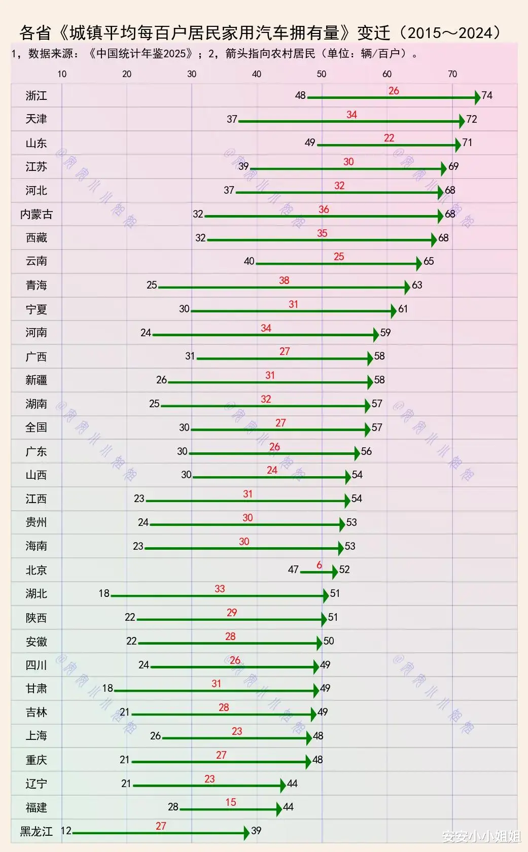 沿海经济发达地区率先领跑,例如浙江省,2024年的数据已达到74辆,意味着平均每百户家庭拥有74辆汽车,位居全国之首。