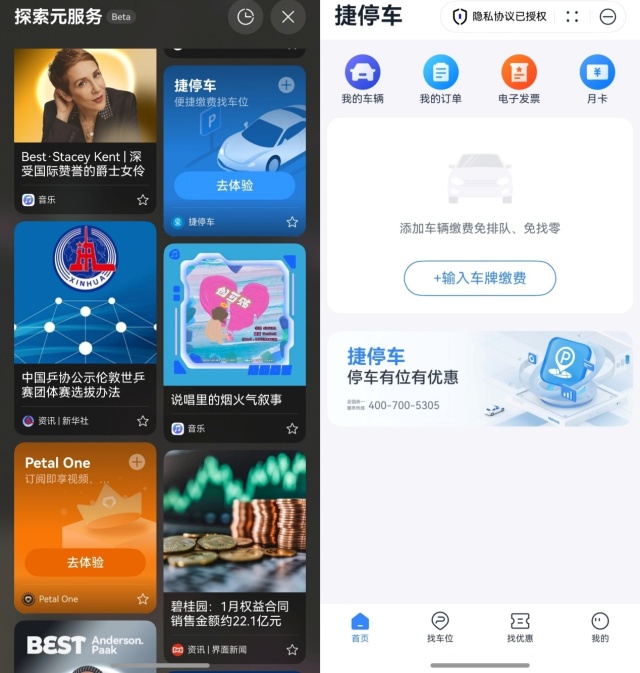 春节期间带父母去市里逛庙会、看灯展,停车位不好找。这时候,“探索元服务”的“捷停车”卡片就派上大用场了。它能直接显示目的地附近的停车场余位,甚至支持一键缴费。当别人还在绕圈找车位时,你已经停好车带着家人去玩了,这体验感直接拉满。