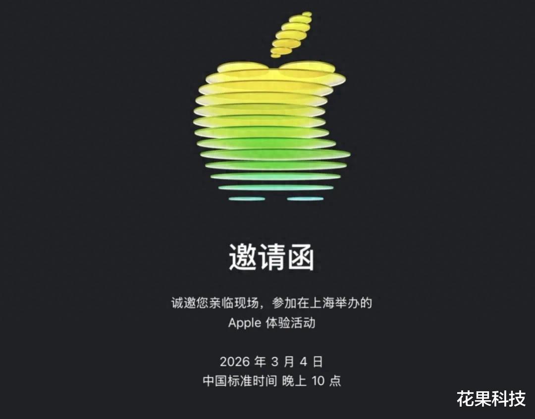 邀请函显示,北京时间 2026 年 3 月 4 日晚上 10 点,苹果会在上海举办 Apple 体验活动,邀请函的苹果 Logo 立体感很强,由黄、绿、蓝三种色彩渐变组成。