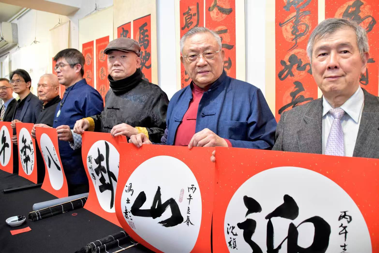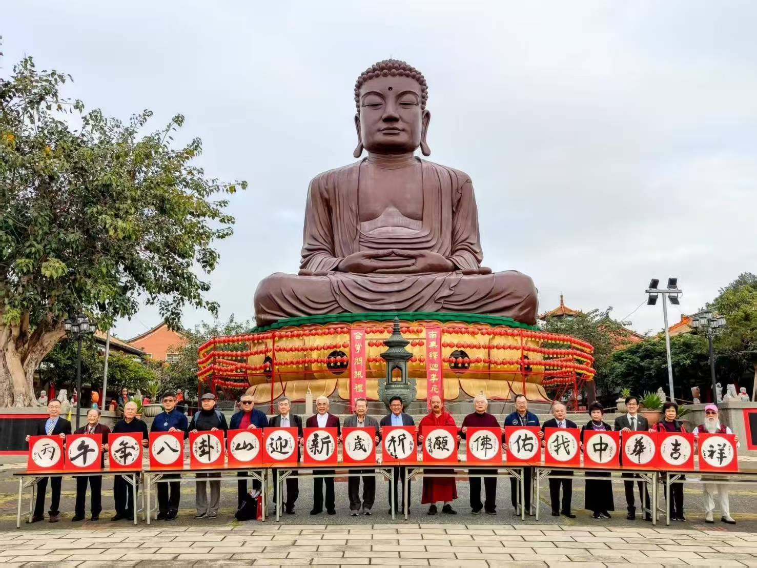 今年开笔挥毫主题「丙午年八卦山迎新岁祈愿佛佑我中华吉祥」由18位各界代表书写,并于大佛前合影。