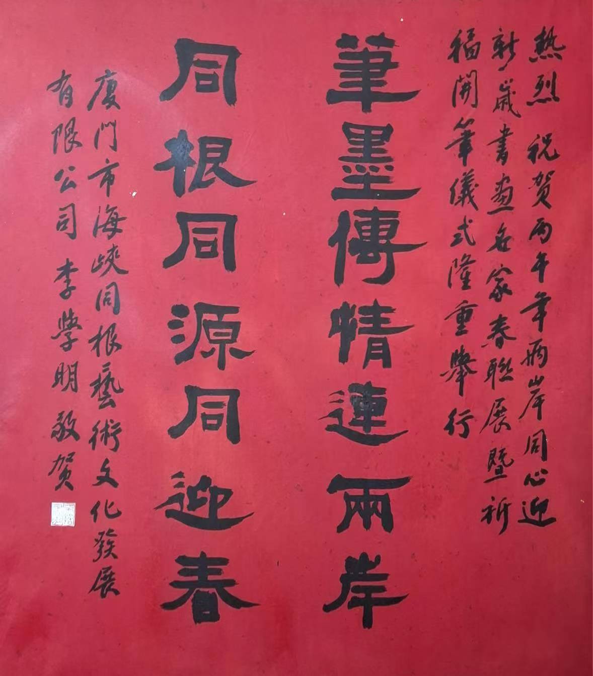 大陆协办方,厦门市海峡同根艺术文化发展有限公司董事长李学明特别发来贺词,「笔墨传情连两岸,同根同源同迎春」表示热烈祝贺之意。