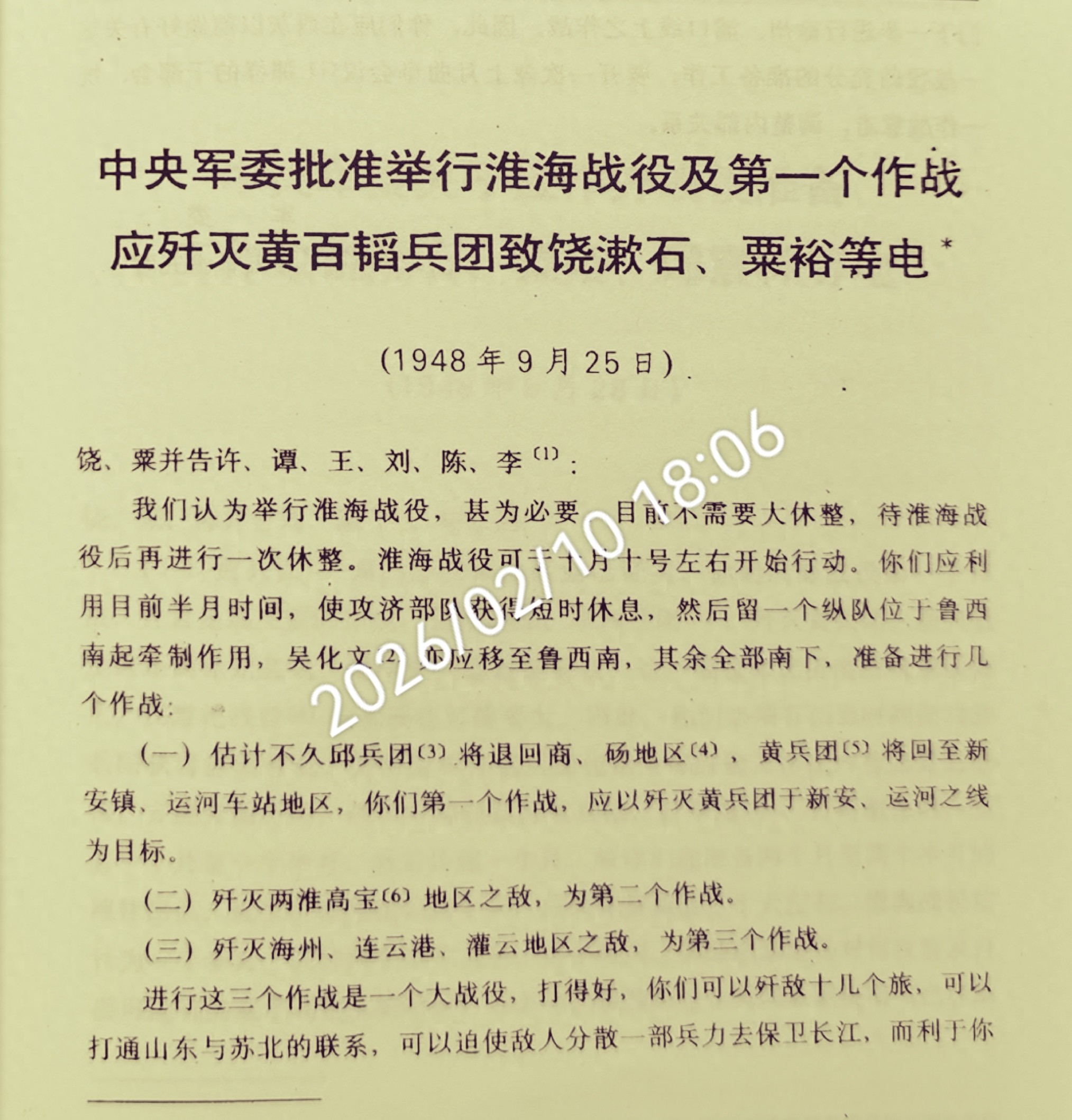 18.1949年1月2日,粟裕、谭震林、陈士榘、张震签发《华东野战军全歼杜聿明集团的命令》。