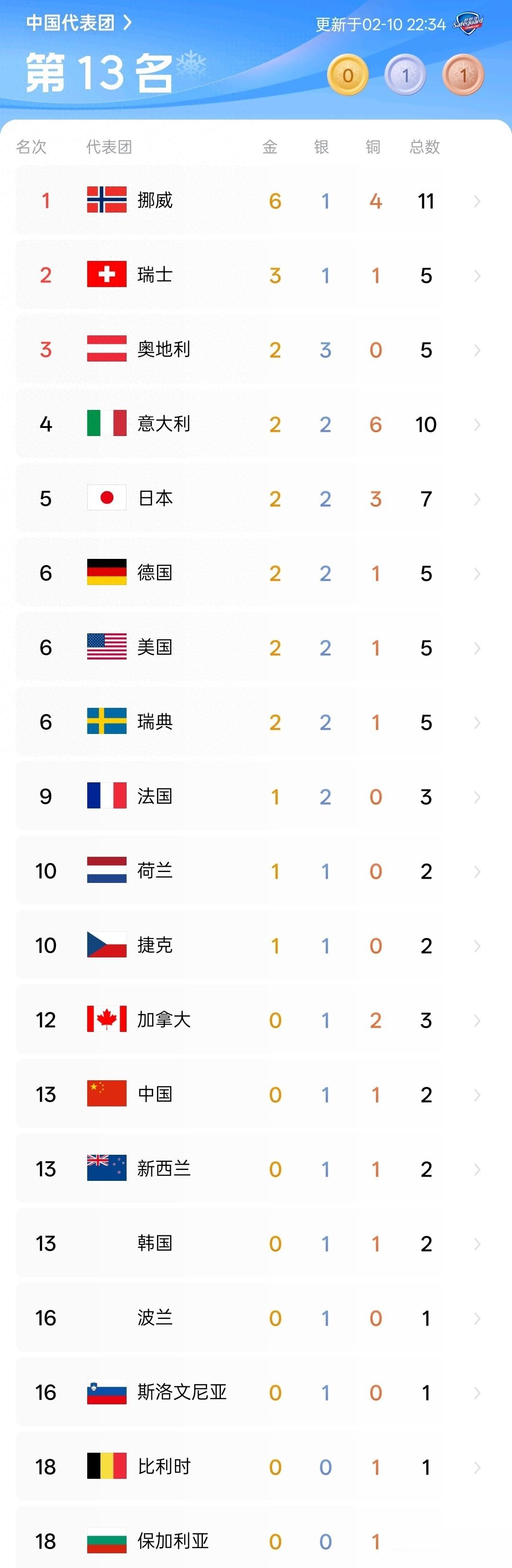 北京时间2月10日晚间,2026米兰-科尔蒂纳冬奥会产生多枚金牌,雪上、冰上赛场竞争白热化。截至发稿时,挪威代表团以6金1银4铜高居奖牌榜榜首,单日再添3块金牌巩固领先优势,瑞士以3金1银1铜位列第二,奥地利2金3铜排名第三,中国代表团暂以0金1银1铜位居第13位。