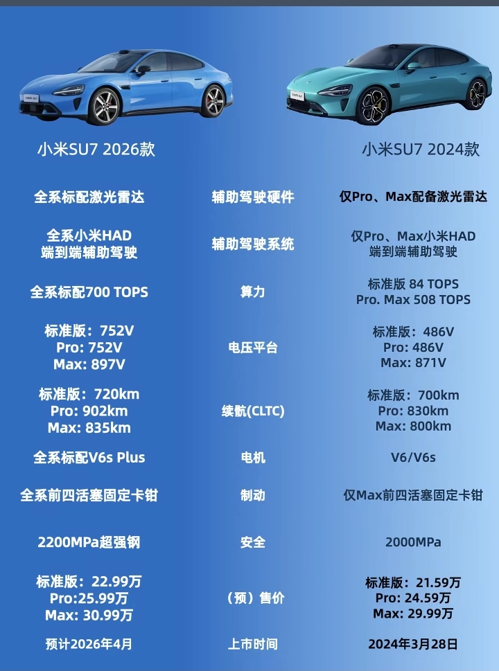 从行业角度看,其“全系标配”策略打破了智能驾驶的价格壁垒,推动同级市场向“无短板体验”竞争——智能驾驶不再是顶配溢价项,而是基础项;充电速度从痛点变为优势。随着4月正式上市临近,新一代SU7能否延续老款的销售势头,将考验小米在技术深水区中的生态整合能力。