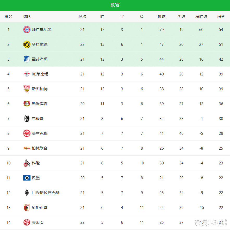 下面是德甲最新积分榜!