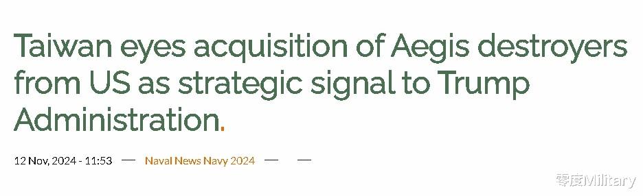 据《金融时报》11月11日的报道,中国台湾地区正在考虑从美国采购“宙斯盾”驱逐舰,作为一项重大防御计划的核心组成部分,旨在加强海上安全能力,应对日益增长的威胁。同时,这一举措也是在向重新当选总统的唐纳德·特朗普发出战略信号。