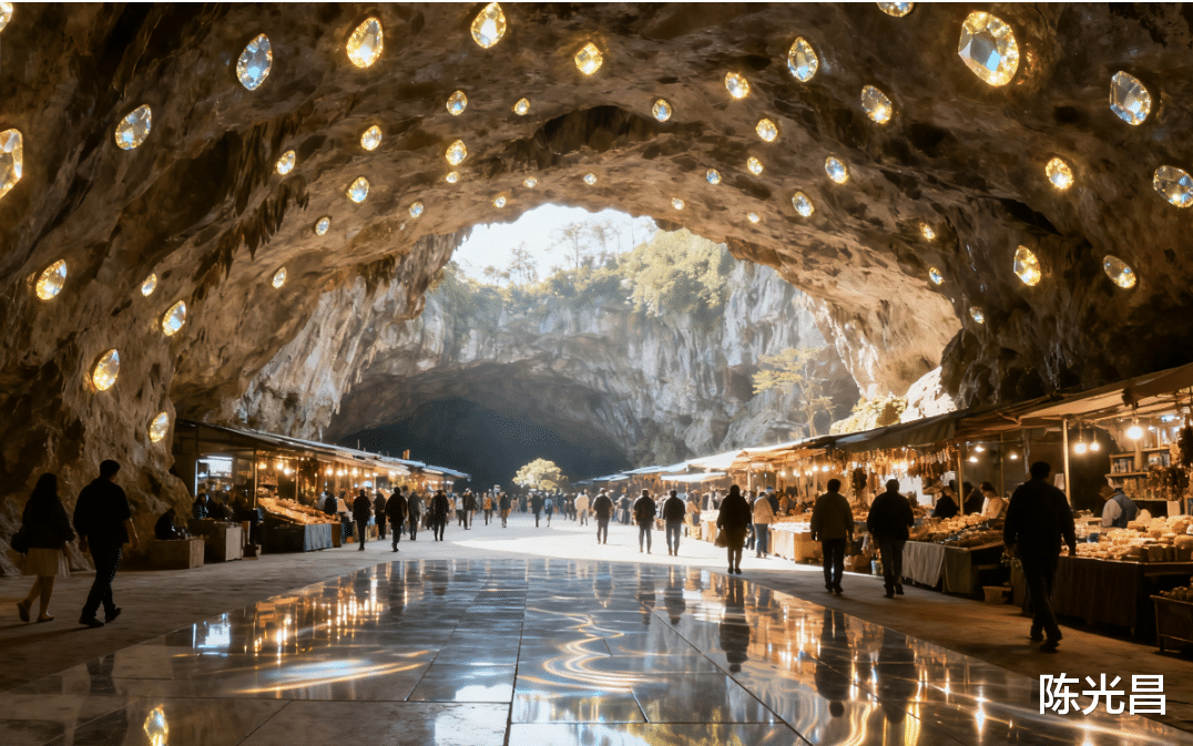 洞内宽阔而明亮,与之前的贫苦洞形成了鲜明的对比。洞顶镶嵌着许多发光的宝石,散发着柔和的光芒,将整个洞穴照得如同白昼。地面是由平整的石板铺成,干净整洁,人们在上面来来往往,络绎不绝。那些石板历经无数人的踩踏,表面被磨得光滑如镜,倒映着洞顶宝石的光芒,仿佛给洞穴铺上了一层流动的光影。