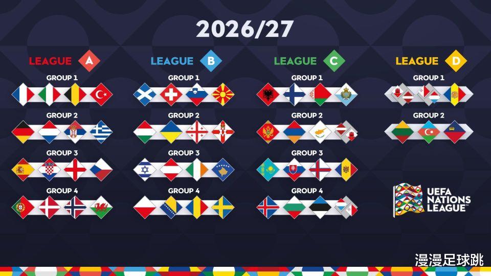 2026-27赛季欧国联分组正式出炉,54支欧足联成员国按照级别被划分进四个层级,A级、B级、C级各4个小组,每组4队,小组赛将于2026年9月24日正式开打,主客场双循环6场小组赛,决赛阶段将于2027年6月9日至13日进行。抽签结束的那一刻,有人松了一口气,有人则当场“头皮发麻”。