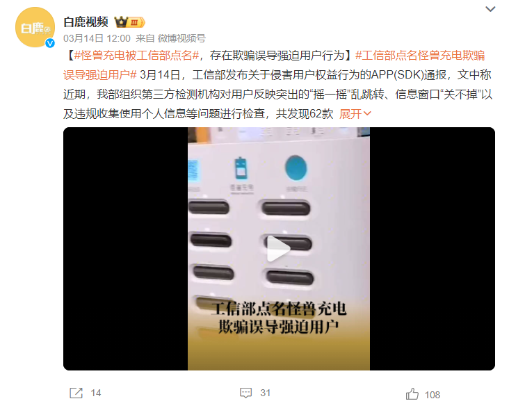 不仅如此,怪兽充电还曾几次被点名。今年,工信部发布了《关于侵害用户权益行为的APP(SDK)通报(2024年第2批,总第37批)》,公告中提出,怪兽充电存在欺骗误导强迫用户的违规行为。6月,怪兽充电因计费方式、标准不合理,产品质量、使用性能有问题,小程序使用体验差被广东省消委会点名。