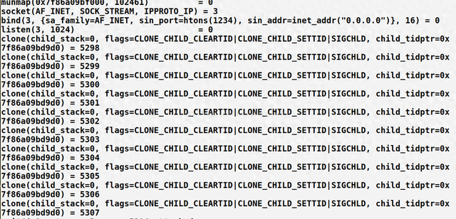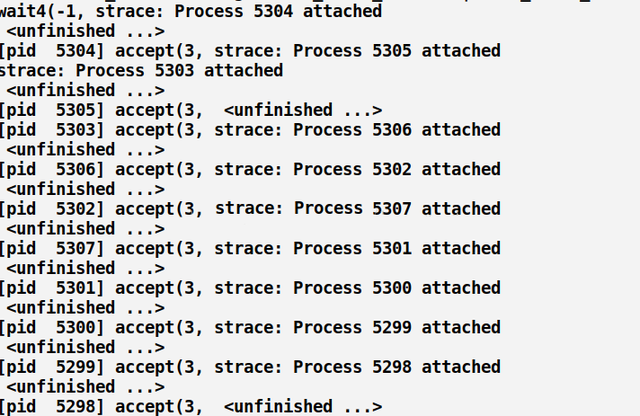一个终端执行strace -f ./server 你会看到如下结果(只截取部分可以说明问题的截图,减小篇幅):