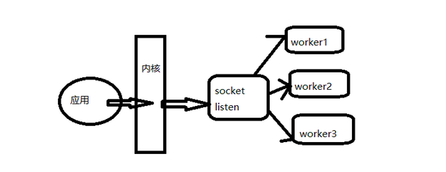 在未开启SO_REUSEPORT的时候,由一个监听socket将新接收的连接请求交给各个工作者处理,看图示: