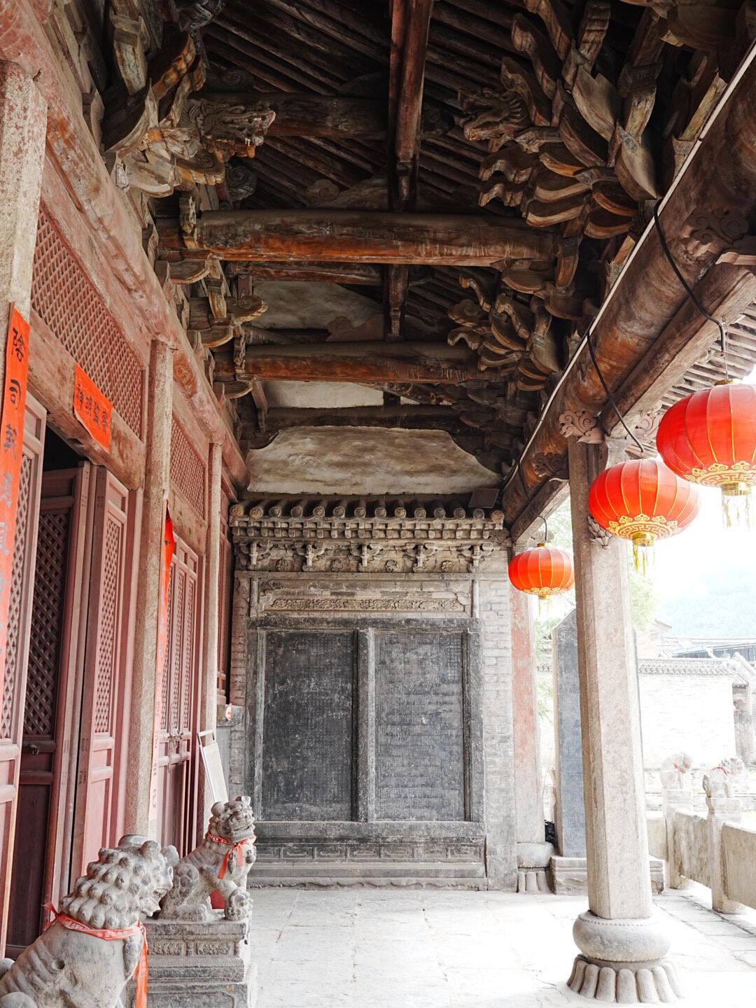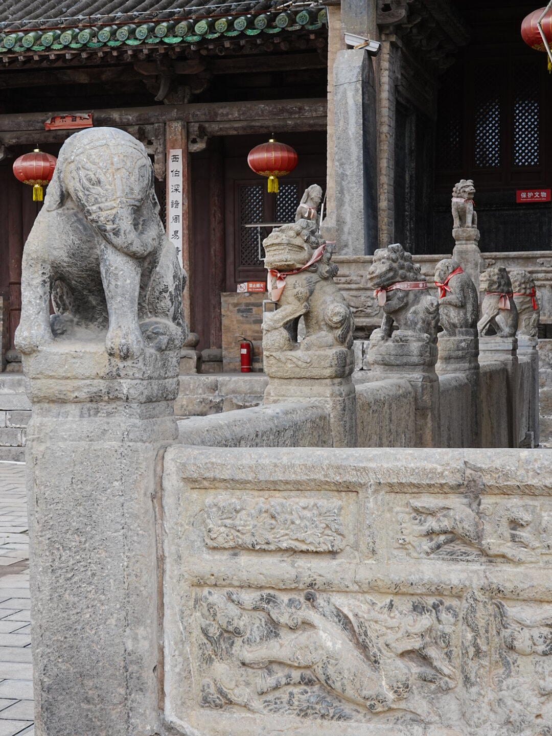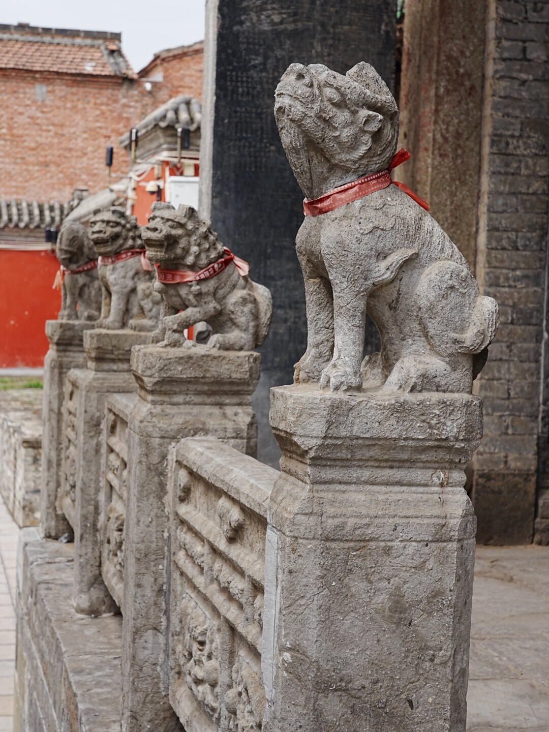 穿过拜亭,天齐殿的气势扑面而来。这座单檐悬山顶的正殿,立在宽阔高台上,面阔五间的布局显得格外大气,进深六椽的设计让空间透着深远,前廊的青石柱四边抹棱,摸上去冰凉又光滑,柱础更是藏着惊喜——束腰之上是鼓形,基座却是文形花瓣柱础,听守庙的老人说,这是金代的原物,历经数百年,依旧稳稳托着殿宇的重量。栏杆上的浮雕和拜亭相似,却多了几分特别:柱头除了常见的狮子,正中两个栏柱上各立着一只獬豸,昂首抬颈的模样,角尖微微上翘,眼神里透着机敏,甚是可爱。殿门两边的石柱前,还蹲着一对小石狮,呲牙张口,像是在小声对话,模样憨态可掬。