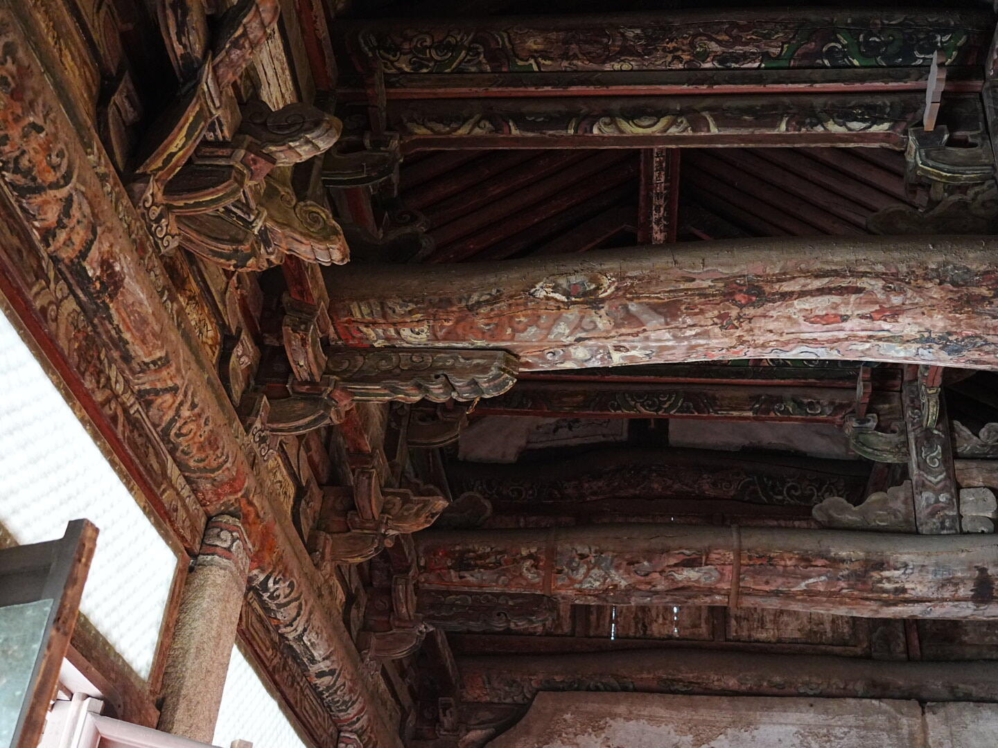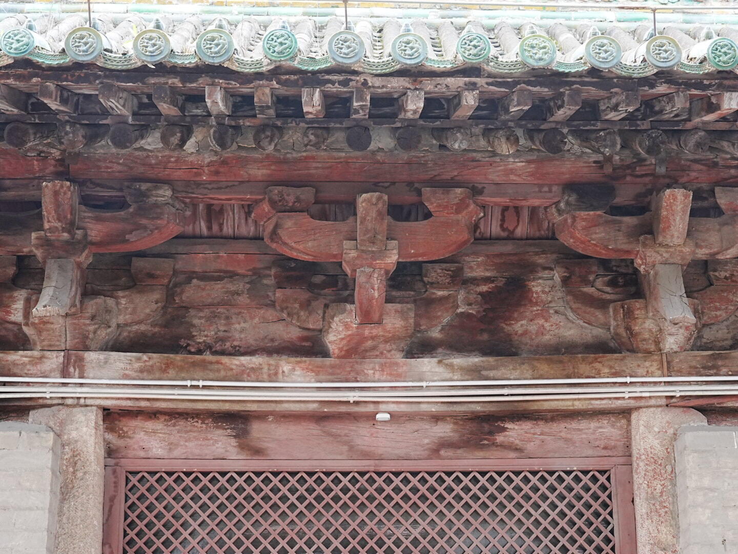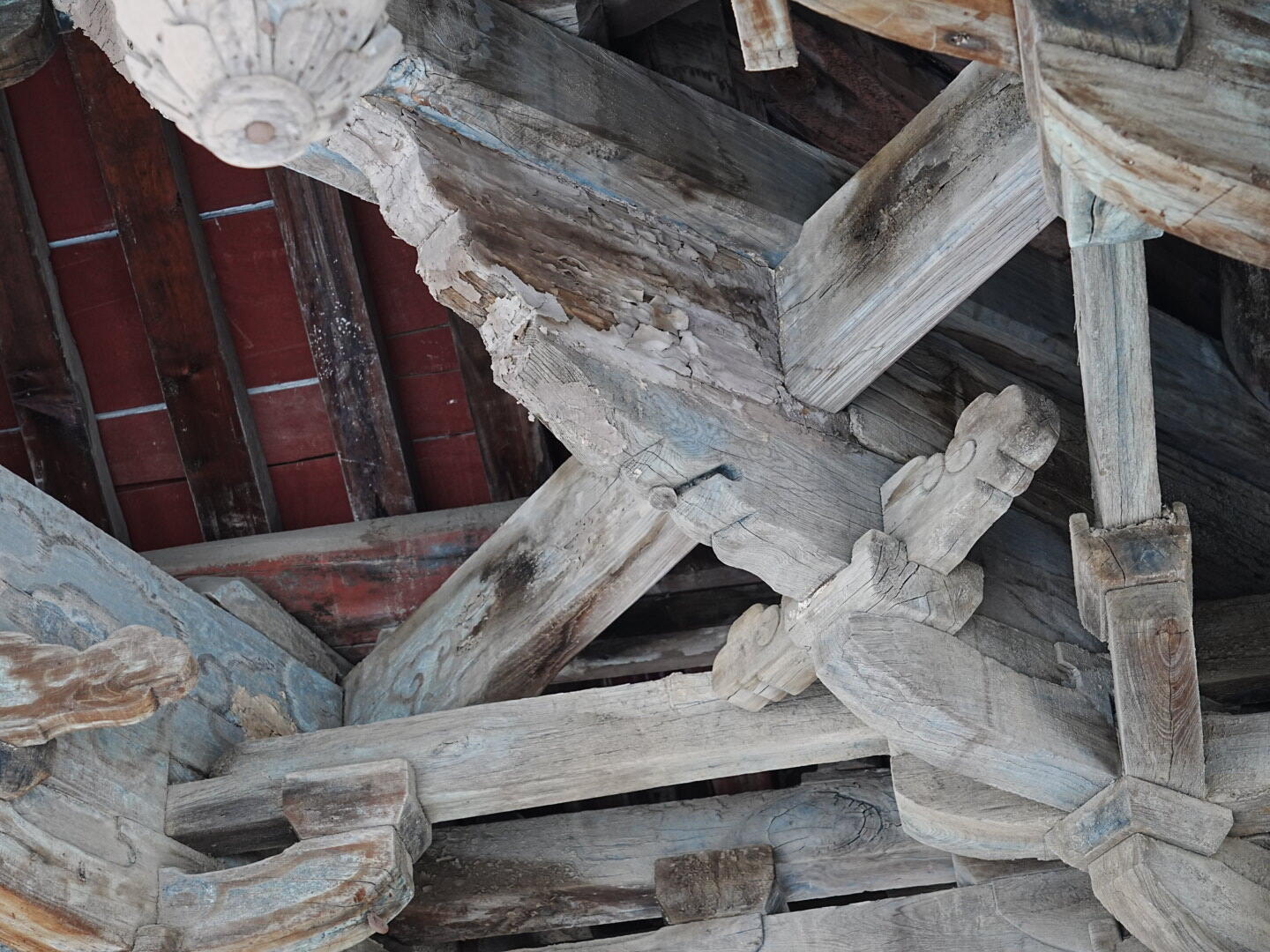 凑近看天齐殿的外檐斗拱,发现了更有趣的细节——五铺作双下昂的斗拱,柱头位置和铺作位置竟不一一对应,还藏着三朵出斜拱的斗拱。老人笑着解释:“这是因为五开间的大殿,前檐只用了四根柱,才造成了这种‘错乱’,可你别看它乱,承重一点不差!”前廊后端的铺作是单杪四铺作,补间各出一斗栱,当心间还藏着斜拱,柱头令栱更是透雕的翼型栱,里转承托着四椽栿,每一处都透着工匠的巧思。走进殿内,抬头看梁架,六架椽屋后四椽栿搭在前乳栿上,隔架用蜀柱合㭼,襻间枋之上,羊角形木构件稳稳托着平槫,没有一根钉子,却严丝合缝得像天然生长在一起,让人忍不住感叹:古人的木构智慧,真是藏在每一处细节里。