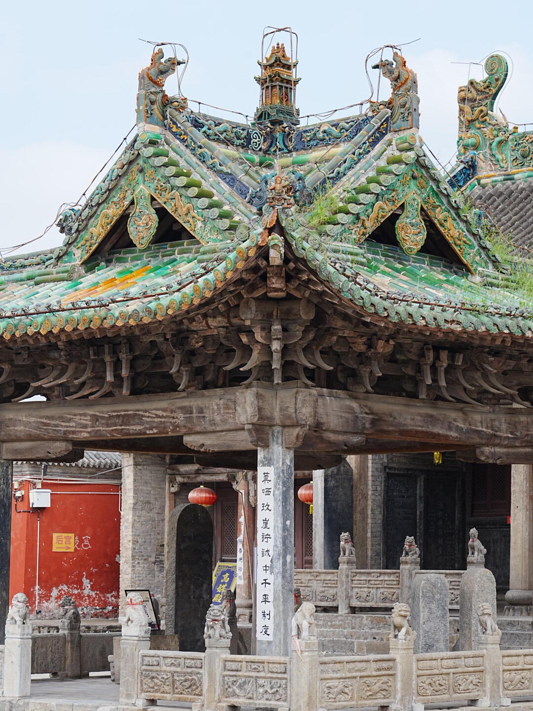 老人说,当年乔氏家族烧制这些琉璃时,光是调釉色就试了上百次,烧坏的琉璃碎片能堆满半个院子,“你看这孔雀蓝,要用上好的钴料,还要控制好窑温,差一点颜色就不对了。”站在琉璃脊饰下,看着阳光在上面流转,突然明白为什么说润城东岳庙是阳城乔氏琉璃的代表作——它不只是把琉璃贴在建筑上,而是让琉璃与木构、石刻融为一体,既有木构的温润,石刻的厚重,又有琉璃的璀璨,像一首用建筑写就的诗。