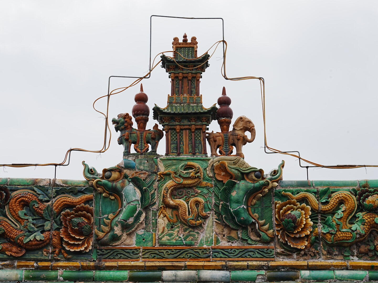 整座东岳庙最让人挪不开眼的,还是阳城乔氏琉璃的风采。拜亭十字歇山的悬鱼和博风板上,金龙游弋的琉璃纹样栩栩如生,龙身的鳞片用不同深浅的黄色琉璃拼接,阳光下泛着温润的光;脊刹上的歇山顶琉璃小楼,四角各站着角神武将,枕戈待旦的模样,铠甲上的纹路清晰可见;走兽挥翅昂首,仿佛随时准备腾空而起。天齐殿的脊饰更是异彩纷呈:正中大象狻猊分驮宝瓶,立在兽首之上,宝瓶的蓝色琉璃通透得像玉;双层琉璃仙楼屹立正中,飞檐叠叠,连窗棂都是琉璃雕刻;正脊上游龙虬蜷,牡丹盛放,鸱吻头上的白角格外显眼,怒目圆睁,血口喷张,角上的力士似负重回首前行,獬豸神采飞扬似在游走,每一处琉璃都色泽饱满,精致得像用宝石雕琢而成。