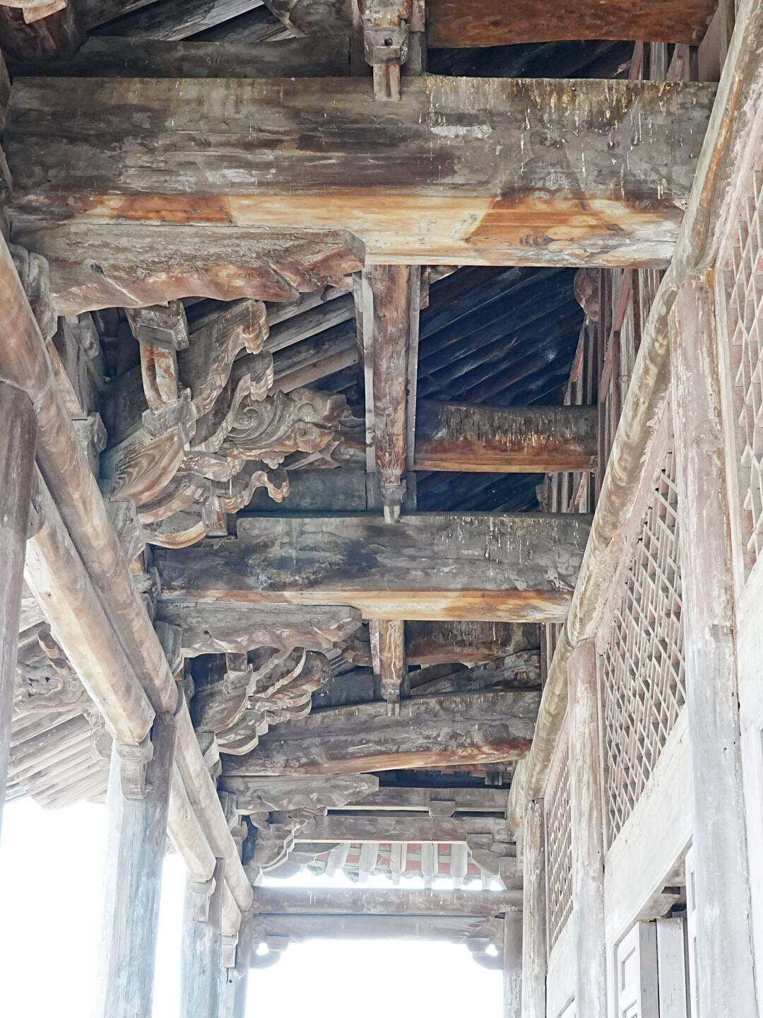 抬头望拜亭的檐角,更被斗拱的精巧震撼。每面出五朵斗拱,还都藏着斜拱的巧思——当心斗拱两侧的斗拱分别向两边倾斜,像展翅的飞鸟般灵动,双下昂五铺作的形制,庄重中透着华丽。顺着斗拱往上看,视线突然被头顶的藻井勾住——那是莲花斗八藻井!八根莲花垂柱从藻井边缘垂下,花瓣纹路清晰得能看清每一片的褶皱,正中的莲花垂柱更是精致,像盛开的菡萏般托起藻井顶端,铺作层叠有致,阳光从亭顶的缝隙漏进来,照在木质的莲花上,仿佛给花瓣镀了层金边,难怪说它是“明代藻井奇珍”,这般清丽又庄重的模样,确实少见。