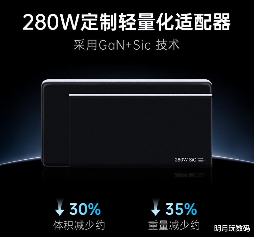 更惊喜的是280W氮化镓适配器,体积减小38%,重量只有700 g,出差再也不用带“板砖”。