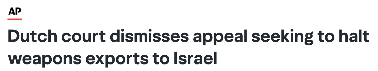荷兰海牙上诉法院于11月7日(星期四)裁定,驳回十家人权组织提起的上诉。这些组织此前起诉荷兰,指控其在加沙地带局势持续恶化下,持续向以色列出口武器的行为违反国际法。