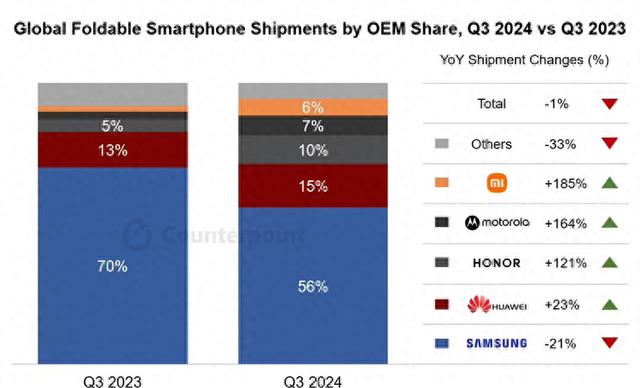 根据Counterpoint Research的调研数据,2024年第三季度欧洲智能手机市场出货量同比增长8%,而在排名前五的手机厂商中,仅有小米出现了销量下滑,三星与苹果依然稳居前二。