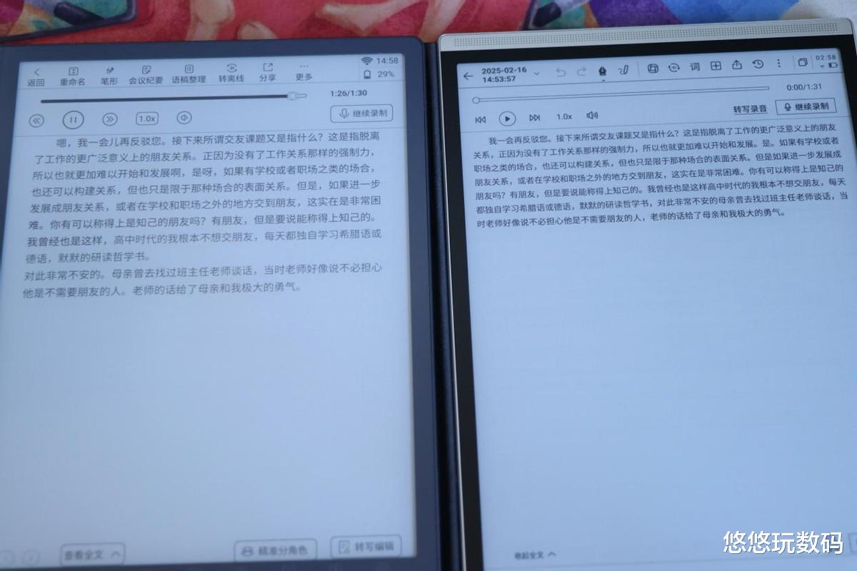 汉王M10 mini和科大讯飞Air2 pro均配备了听书功能,汉王M10 mini支持14种AI人声,而科大讯飞Air2 pro只有7种AI人声,在听书的过程中汉王M10 mini会跟随朗读借助划线定位书籍位置,而科大讯飞Air2 pro在听书过程中不能实现跟读定位,读者有时候不知道朗读到什么位置了,不方便批注内容。