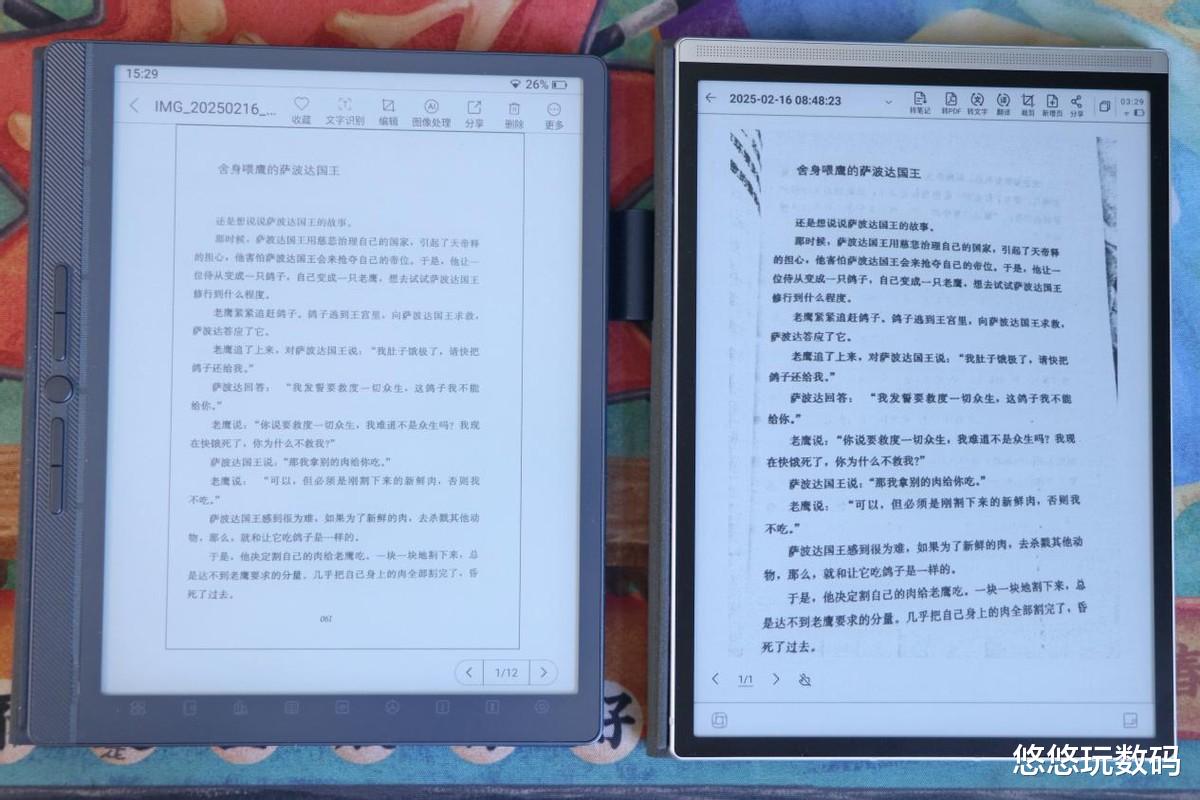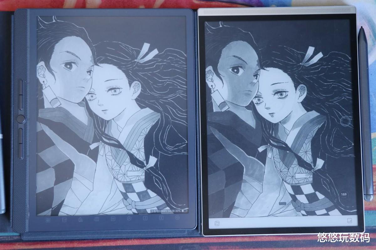 就二者的白天显示效果个人感觉汉王M10 mini更加自然舒适干净一些,并且长时间显示不会出现残影,有多达17种字体可选择;在相同字体显示下科大讯飞Air2 pro的字体线条比较粗,文字边缘看起来有点模糊感,而且页面菜单长时间显示后会留下残影,可通过清除残影功能消除,字体种类只有6种。通过漫画展示对比可发现汉王M10 mini能够保留更多画面细节,黑白灰的过渡明显,不会像科大讯飞Air2 pro一样黑的全黑,缺乏画面层次感。