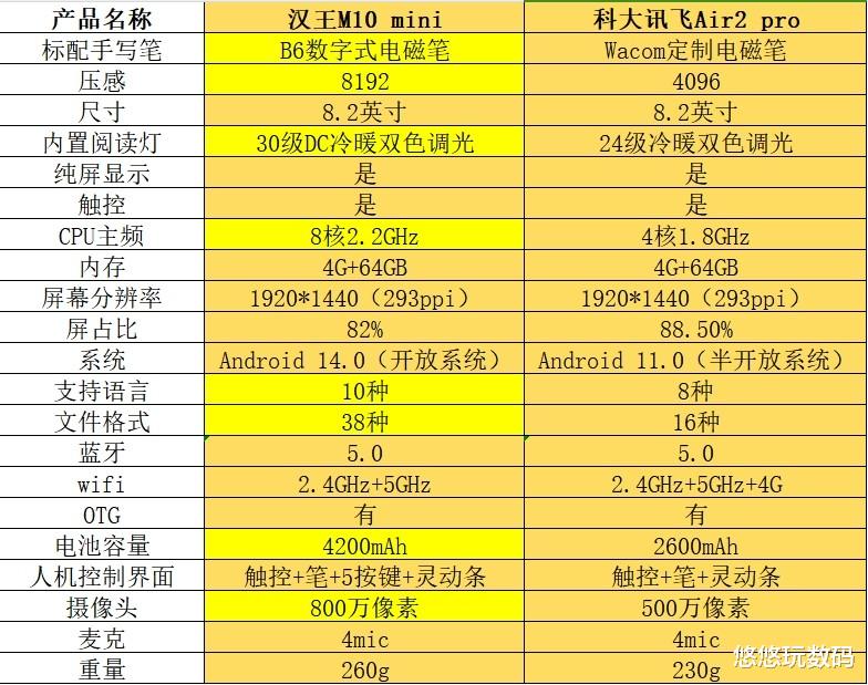 这两款产品都是主打办公和阅读的阅读器,但在主要功能上又有所侧重。汉王M10 mini和科大讯飞Air2 pro均搭载了8.2英寸墨水屏幕,但汉王使用了显示效果更好的自研屏,屏幕的整体透性会更高,阅读书写观感要更优秀。另外汉王M10 mini的处理器和手写笔要强很多,其他硬件配置基本一致,最重要的是汉王M10 mini的价格相比科大讯飞Air2 pro要便宜600元。本文将从手写场景、会议记录、AI创作等方面进行对比体验,将实际使用感受分享给大家。