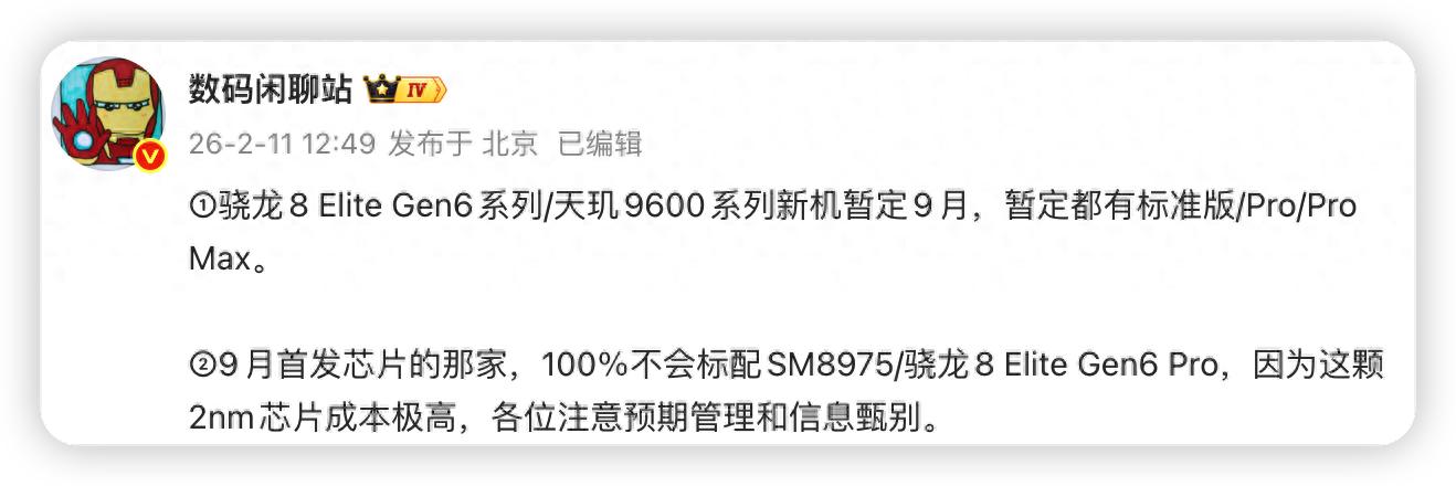而最近这个事情得到了进一步的确认,根据站哥的爆料来看,这波新机暂定9月发布,都是标准版/Pro/Pro Max三杯齐发,而且明确提到9月首发芯片的那家,100%不会标配骁龙8E6 Pro处理器,因为骁龙8E6 Pro的成本太高了。