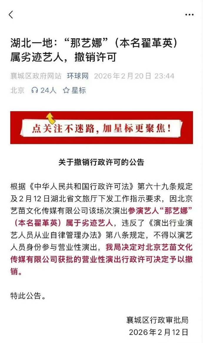 一纸官方通报,让争议缠身的那艺娜(本名翟革英)彻底“凉透”。2026年2月12日,湖北省文旅厅正式将其定性为“劣迹艺人”,不仅叫停了她在襄阳的演出,更直接撤销了其所属公司的演出许可。这场从“假俄罗斯美女”到“全网热歌制造机”的魔幻走红史,终于迎来了官方盖章的结局。
