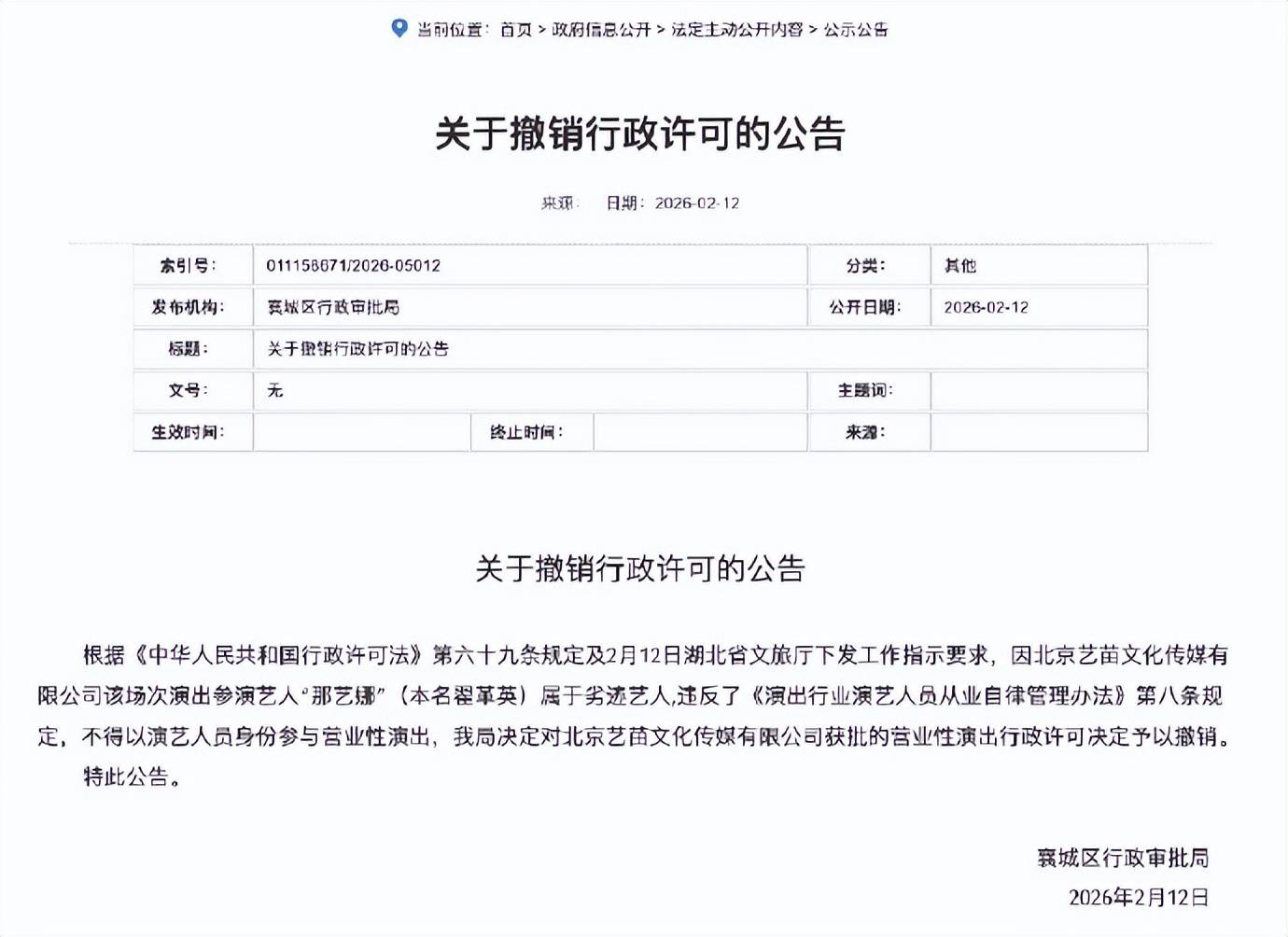 根据襄城区行政审批局的公告,这次处理依据的是《行政许可法》和文旅厅指示,直指那艺娜违反了《演出行业演艺人员从业自律管理办法》中关于劣迹艺人的禁令。换句话说,她的演艺之路,被官方从规则层面画上了休止符。
