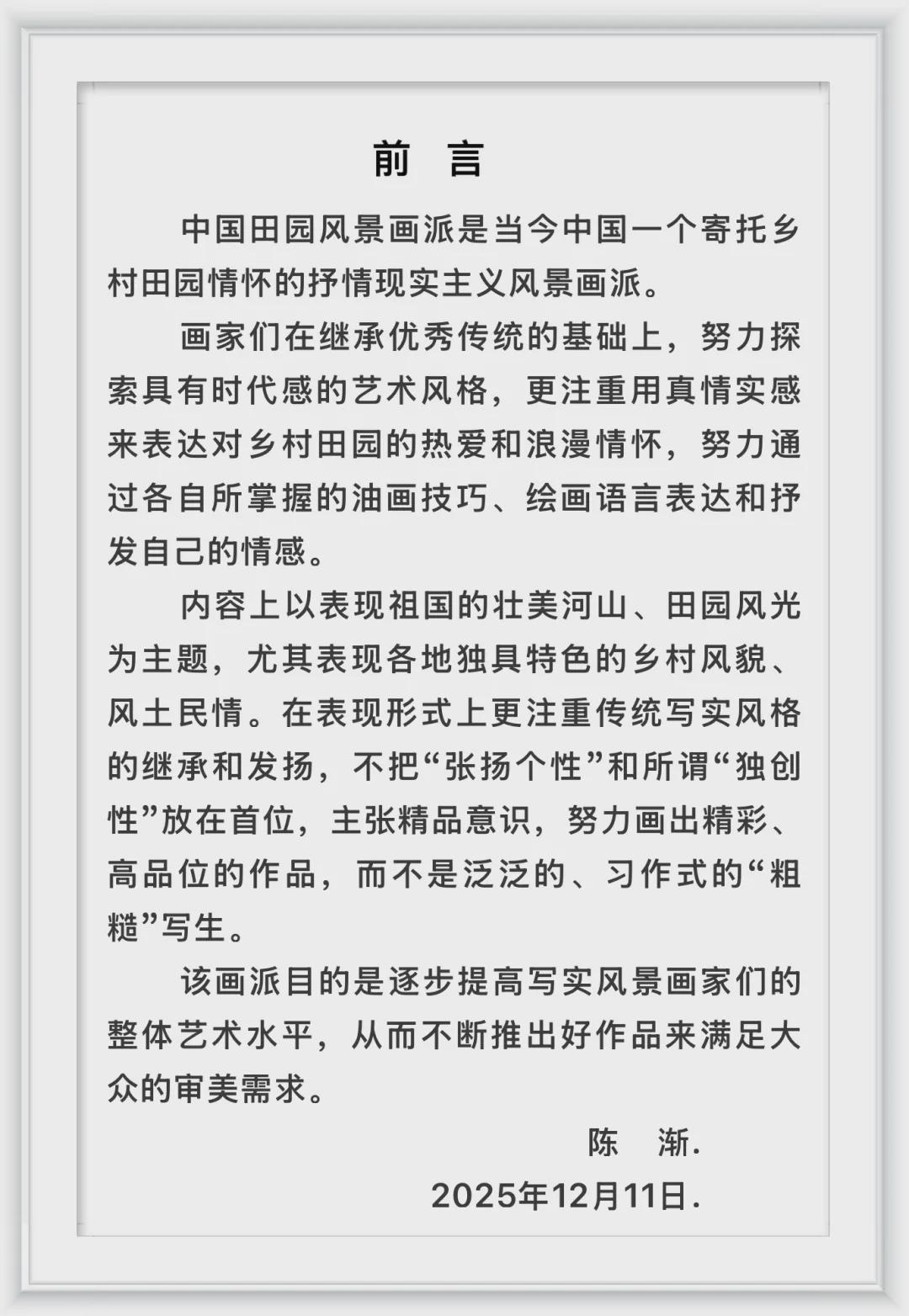2025年12月31日.•表现手法:具象、意象、抽象、心象,随心随性。•艺术理念: 所思 、所画只与艺术有关。不排斥其他任何艺术追求和艺术团体,也不与其他任何艺术团体相冲突;在创作中推崇广泛吸收和多元的艺术方法,既是对古代艺术和现代主义艺术的延续也是对它们的发展。以欧洲传统的写实手法为基础,结合中国的写意精神,主要表现21世纪上半叶中国和部分欧洲国家的社会变迁和田园风光、湖沼池塘、山石树木、乡野村居、古村老店、名人遗迹等等。深爱着这片土地和人民,表现社会进步美和自然美以及世俗生活之美。艺术之美是不能完全用语言来表述的,只能用艺术来表现。“包容与共存”、“继承与创新”。大家都彼此尊重每个成员的艺术追求,“个性中寻求共性、共性中追求个性”;“每个人的心中都有动听的歌,笔下都有自己喜欢的画”;“谁也不限制谁、谁也不改变谁”。艺术追求是自己的事,艺术之路自己选择。自己的路自己走,走得好不好,全靠自己努力。•发展方向: 根基在西方,也在中国,发展方向在中国,也在世界;也就是坚持油画的本体性,有限度地吸收中国的写意手法,视觉感受仍然是油画;坚持油画民族化,画出具有中国人审美喜好的中国风景。这里要强调一下,中国风景,主要是描绘祖国大地的真山真水和有中国味、中国情的风景油画。努力学习、认真研究厚重的世界和中国风景油画发展史,特别是17世纪的荷兰小画派、19世纪法国巴比松画派、印象派、后印象派、野兽派、表现主义和中国20世纪80年代乡土绘画、川西风情绘画、21世纪初的写意油画、中国南方油画山水画派等等平淡天真的艺术追求,综合性地探索和发展前辈大师的风格。努力向莫奈、毕沙罗、西斯莱、柯罗、杜比尼、列维坦、塞尚、梵高、高更、雷斯达尔、维米尔、吴冠中、苏天赐、沈行工、马一平、简崇民、王铁牛、王嘉陵、罗晓航、曲湘建、陈渐、张国忠、窦鸿、周武发、吴建国、陈和西、王辉、张冬峰、翁凯旋、白羽平、李猛等等中外风景画家学习。借鉴荆关董巨、李刘马夏、倪瓒、沈周、赵令穰等等中国古代山水画大家对山石树木、烟云雾霭、水岸汀洲、村居野渡的处理手法,身居现代,远追古人。“游山玩水、寻古觅幽”。学习前人,并努力突破前人;有艺术之根,又努力寻找发展方向。不做西方艺术的盲目崇拜者,也绝不做夜郎自大的排外者;在这一脉相承的发展中,中国田园风景画派产生于这个时代、成长于这个时代。远溯中国古代田园诗派之意境,努力把中华民族“爱田园、好山水”的情怀继续传承与发扬。作品较多地反映闲适澹泊的思想情绪,色彩雅淡,意境清幽。把诗情画意作为中国风景的追求方向,多采用写实兼写意的表现手法抒发自己的内心情感。在发掘自然美方面,既概括地描绘雄奇壮阔的景物,又细致入微地刻画小桥流水人家的微观动态。淡泊,但不避世;怀旧,但不守旧。在中华民族伟大复兴的时代,苏派、法派、德派、美派对中国油画的影响渐行渐远,中国田园风景画派应时而生。中国田园风景画派具有典型的时代特征和中国特征,画者站在世界艺术和现代的视角表现原乡之美。有艺术回归纯真之态,而无复古之意,努力将中国风景油画的意趣向前推进。•内容题材: 内容题材多样性,暂时不突破风景油画的概念;杜绝艺术程式化和千篇一律,坚持以写生创作为主,在条件不够的情况下,也参考资料或者借助网络写生创作。大主题,小切口;一画一景,每画不同。“山川草木本无情,是人有情”。题材多样化,风景、花卉、人物、主题各取所好,以风景油画为主。•艺术思维: 永远不满足既有的水平,不骄不躁、努力学习、静心钻研、不断提高。不用固定思维看问题和看艺术,认为“不确定性是一种美”、艺术是人类永远的精神寄托。艺术进化论和艺术单线发展理论是不正确的,艺术是多元发展和树枝状多线性发展。坚信只要有人类在,艺术就不会死亡……