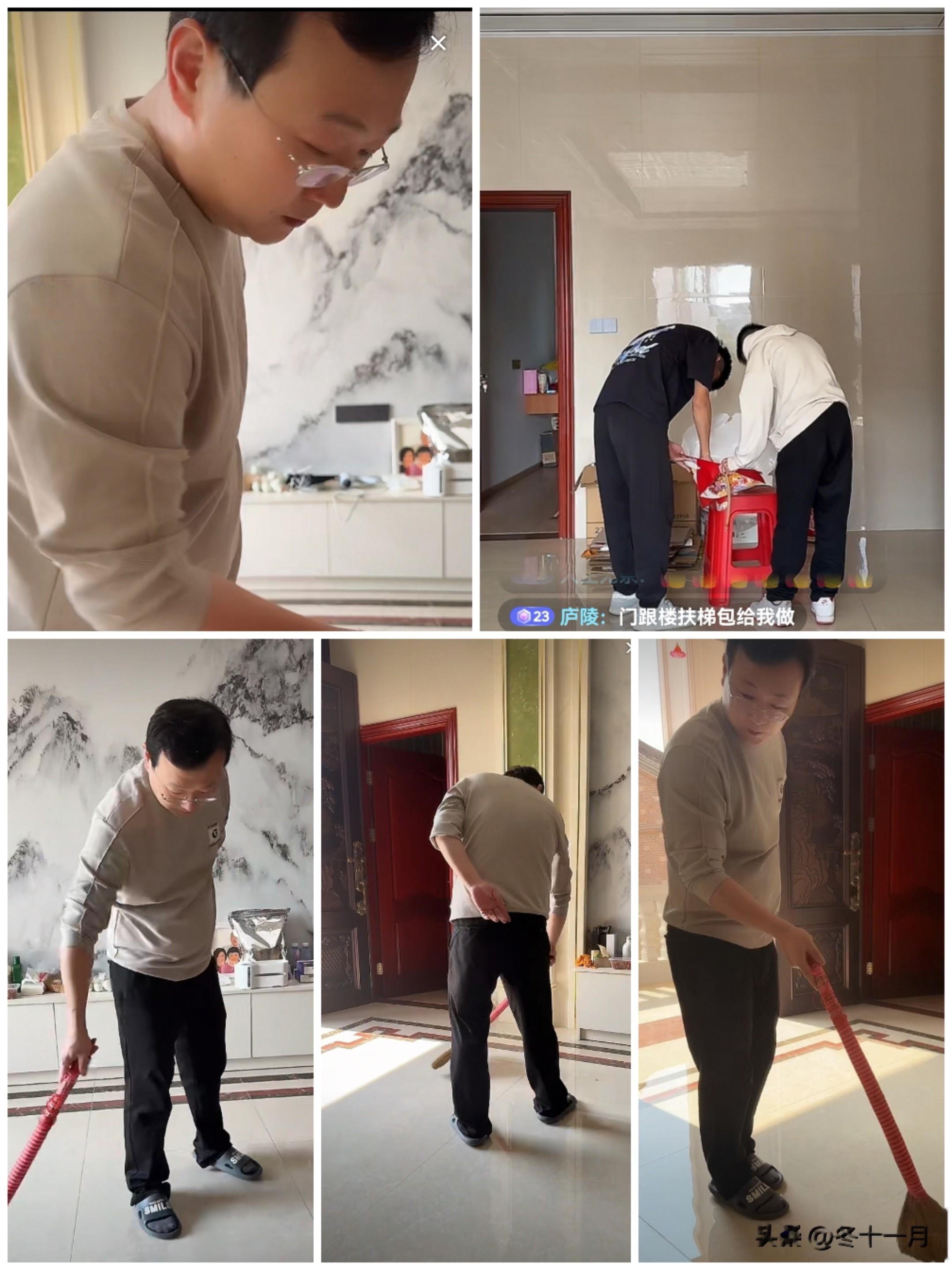 回到瑾汐的直播间,我们可以看到家里的几个孩子正在收拾卫生,不一会儿,国民好大哥也踏入了镜头,他在扫地。