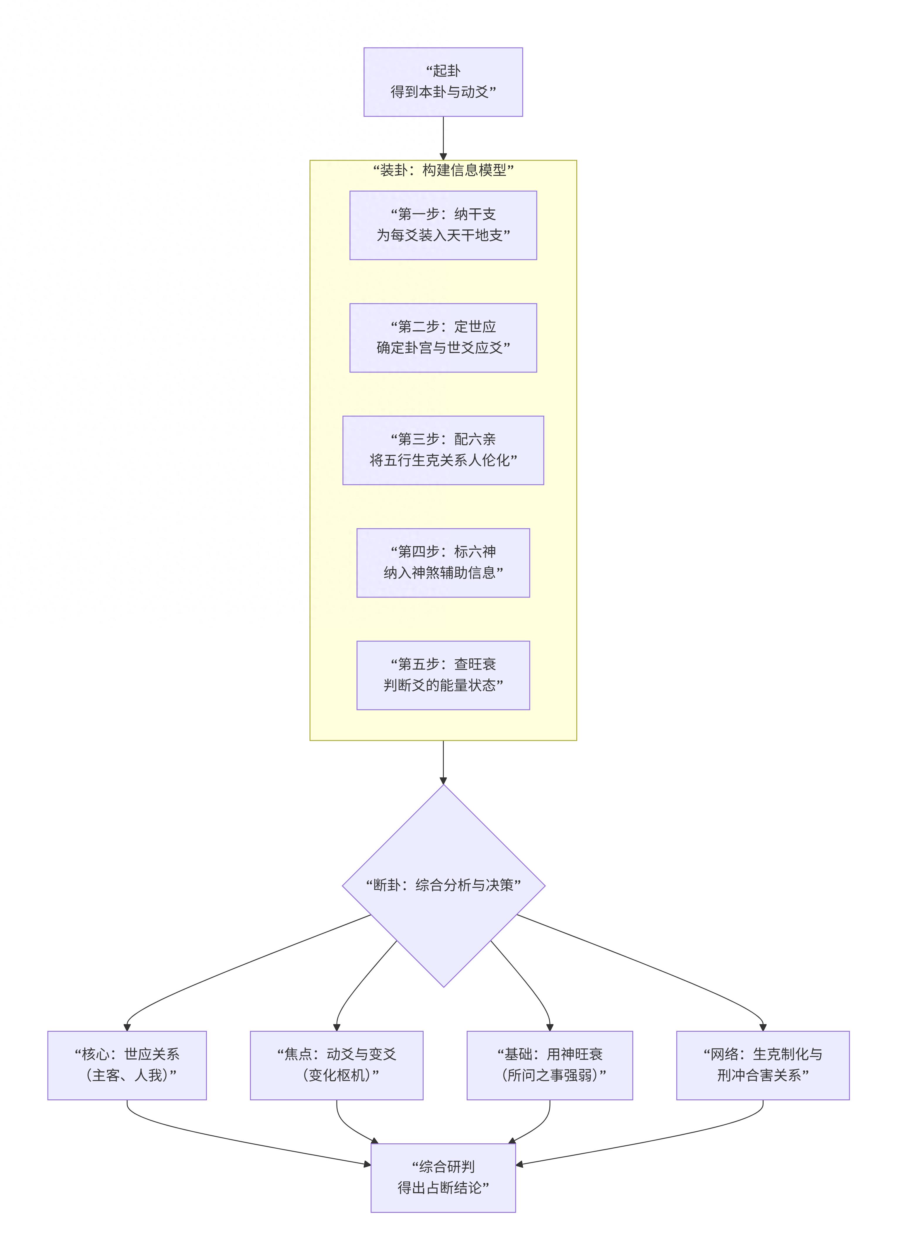 一、核心总览:纳甲筮法的完整流程架构纳甲筮法是一个环环相扣的严密系统。下图为您展示了从起卦到断卦的完整逻辑链条与核心操作模块:
