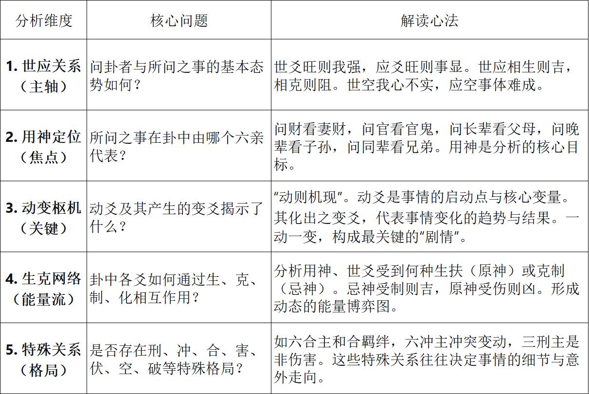 三、断卦心法:五大关系的综合研判装卦完备后,便进入综合分析的“断卦”阶段。需统筹审视以下五大关系网络: