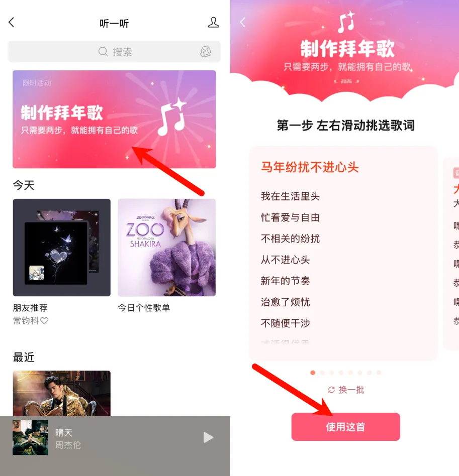 下拉小程序窗口进入「听一听」界面,即可找到刚上线的「制作拜年歌」功能。