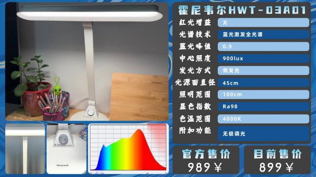 儿童台灯哪个品牌更护眼更好?霍尼韦尔HWT‑03A01整体的表现比较中规中矩,以基础护眼照明和耐用设计为核心。灯头为侧发光结构,配合45cm的宽幅发光面,使光线沿桌面横向铺开,整体照明范围可覆盖约1米的桌面。其中心照度约900lux,亮度表现中规中矩,满足日常书写和阅读需求。但它的显色指数达Ra98,对文字、图像和物体颜色的还原较为真实。