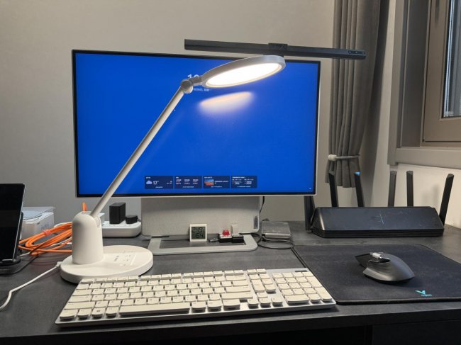 它最大的亮点在于58cm的长条形灯罩设计,配合立体双光源结构,主灯向下直发光提供基础照明,上方辅助光源负责漫射补光,整体照明范围可覆盖约1.4米宽的桌面,亮度表现也比较突出,中心照度可达1600lux以上,大桌面学习完全够用,只是在高亮模式下局部可能会出现些许眩光。