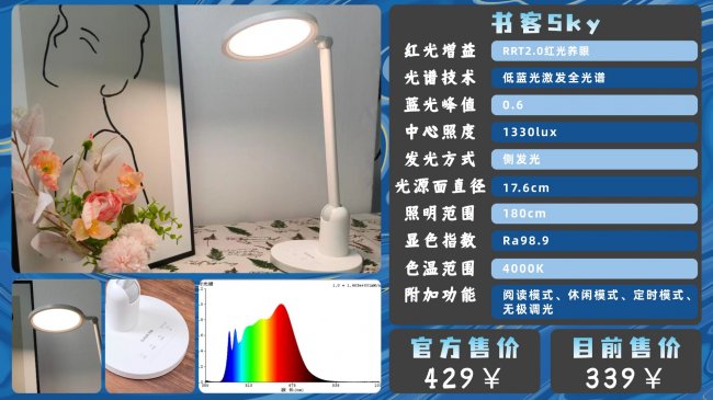为了解决市面上百元护眼台灯护眼效果不足的问题,书客sky坚守了一直以来「明·护·广·养 」四重守护理念,通过十年以上的护眼研发经验,突破了传统照明技术的局限,专研出SunSilk™护眼芯片和5域环控光学系统的创新性组合,通过高密度导光板与多层扩散膜组合,结合类自然光谱智能驱动,形成多维度光线调节机制。结合DT多维漫射2.0技术,光线在发出的过程中经过精密漫射与动态校正,实现全方位柔和覆盖。它家创新设计了RRT2.0硬核养眼黑技术,相比传统的护眼台灯,能够更加精准的抑制住400-450nm有害高能蓝光,将红光效果增强至极限,每天“三分钟”即可为眼部输送养分,也正因如此,书客sky成为了百元价位深度护眼的理想之选,护眼性能使用非常卓越!