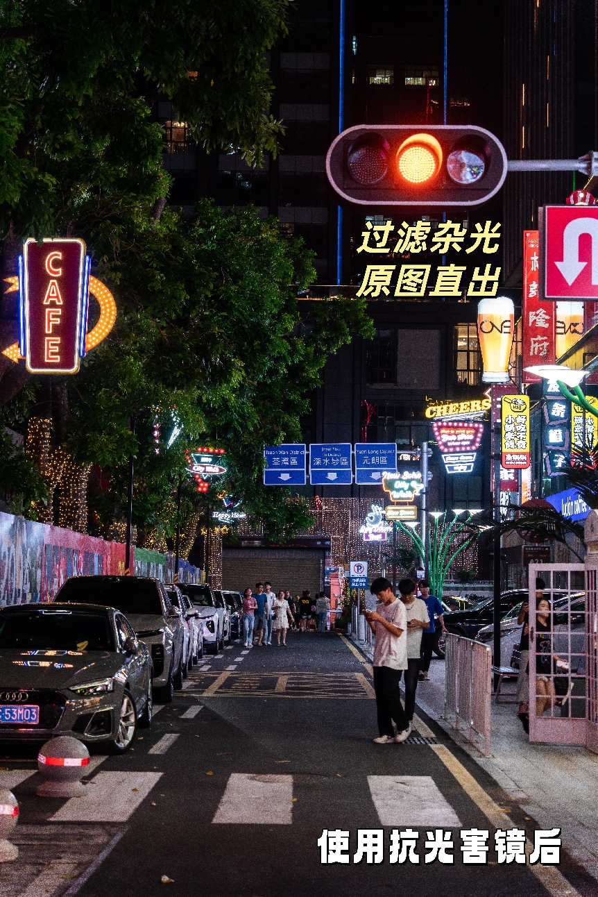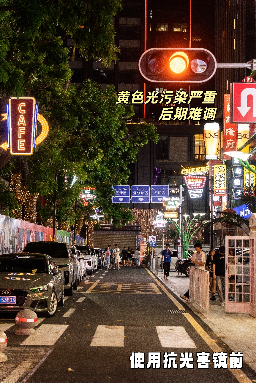 它的原理很简单:精准削减路灯、广告牌的黄橙色光污染,提取隐藏在杂光下的真实色彩,不会影响画面其他部分的色调。
