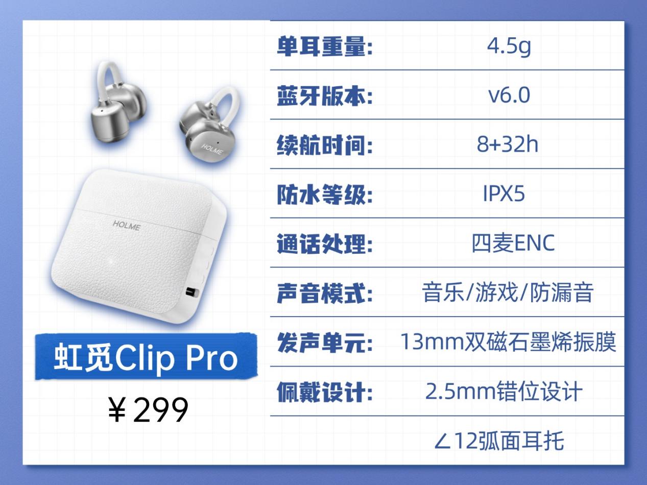 虹觅Clip Pro:耳机的性能也同样能打!支持虹觅自研的防漏音模式,开启后可以明显感受到降漏音效果。采用目前最新的蓝牙6.0芯片,进一步提升连接稳定性;一副耳机四个麦克风的配置,让通话效果更加出色;支持智能一拖二,双设备连接,来电自动切换。IPX5防水,游戏模式,8+32小时综合续航,性价比直接拉满。