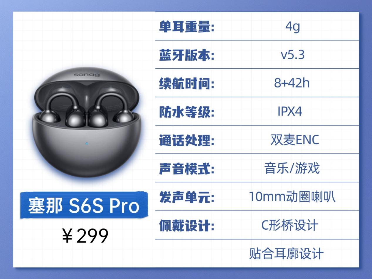 塞那 S6S Pro:这款耳机的优势很突出,双麦ENC通话降噪能稳稳保障通话清晰,哪怕在嘈杂环境里沟通也不受影响;内置蓝牙 5.3 芯片,连接稳定性在线很省心;续航更是亮眼表现,单耳单次能听 8 小时,搭配充电仓总续航直接拉到 42 小时。美中不足也很明确,不支持一拖二功能,日常实用性难免打折扣;另外要多留意,它的防水等级只有基础 IPX4,日常使用得做好防护避免受潮。