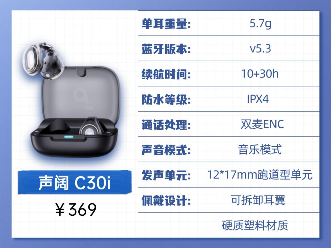 声阔 C30i 太空舱:这款耳机耳翼支持拆卸,调整后能更好贴合耳廓,佩戴适配度挺不错。单耳仅 5.7g 的重量,上耳基本没什么负重感,美中不足的是机身整体材质偏硬,长时间佩戴下来,耳朵会产生明显不适感。