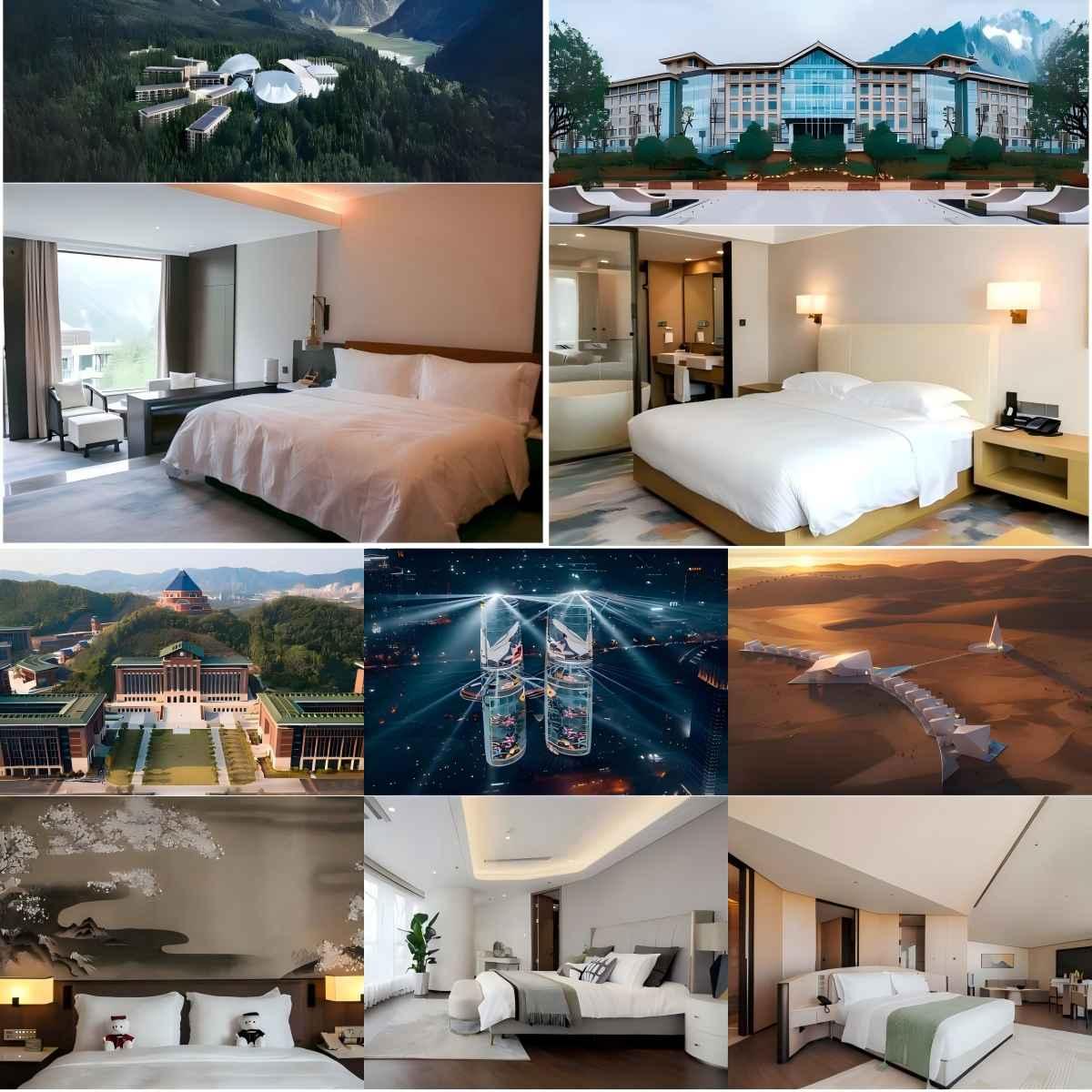 图注:慕思部分合作案例展示。从左至右依次为:九寨天堂洲际大饭店、丽江晶玺希尔顿酒店、中山大学深圳校区——中大学人苑、成都交子荟·国际公寓、宁夏中卫沙漠钻石酒店