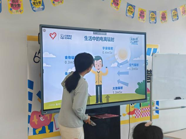 活动现场,葛星用PPT展示了精心设计的辐射地图。“原来我们每天吃的食物、住的房子都有辐射啊!”小朋友们纷纷惊叹。在讲解过程中,葛星老师不时暂停提问:“谁能说出前面提到的核技术应用?”小朋友们争先恐后举手,回答“医疗、农业、发电”等答案。